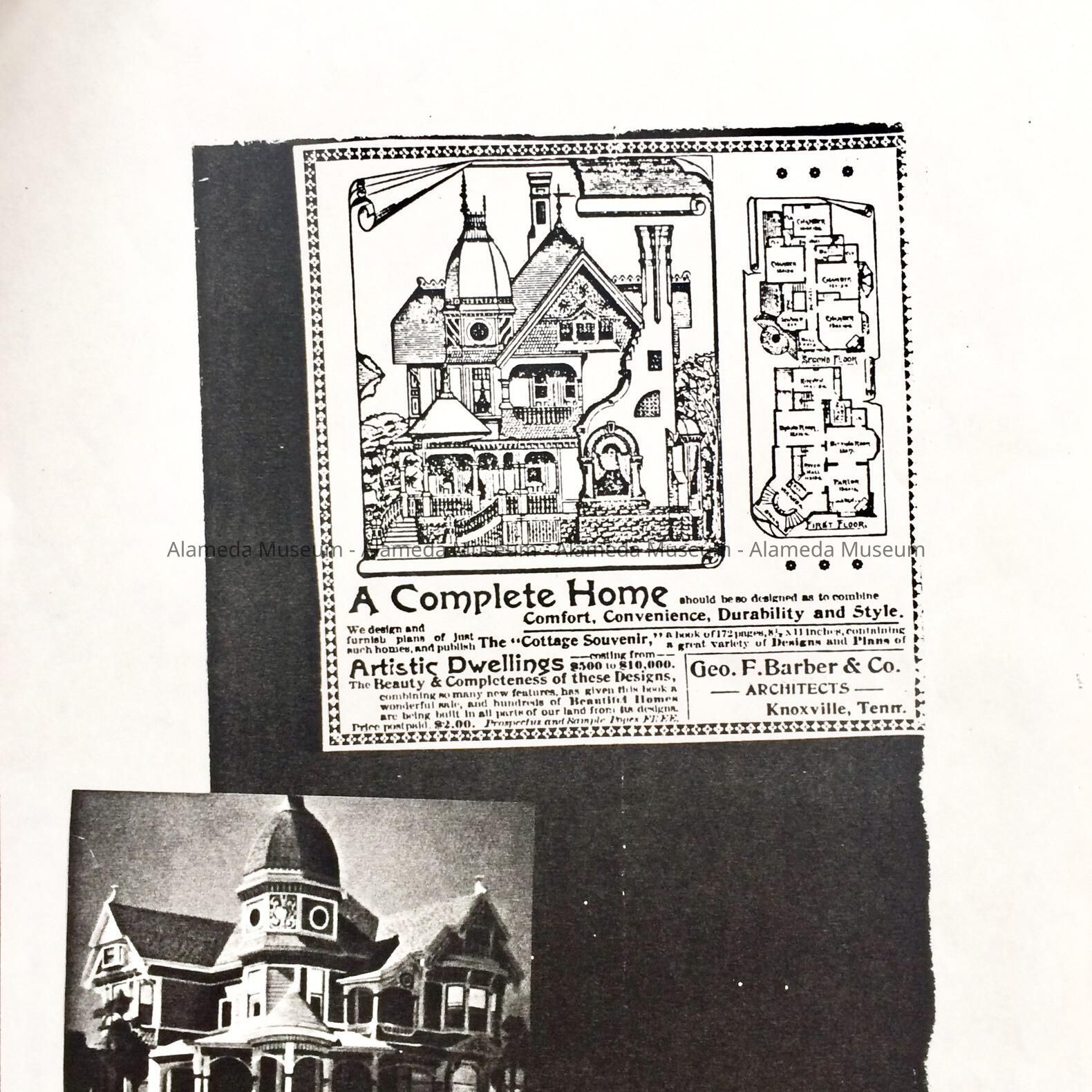 A PHOTOCOPY OF A PHOTOGRAPH OF THE EXTERIOR OF 2070 SAN JOSE AVENUE, WITH EARLY STREET LIGHTING DEVICES, A CURRENT PICTURE, AND A REPLICATION. GEORGE BARBER & COMPANY, ARCHITECTS, KNOXVILLE, TENNESSEE. THE PHOTOCOPY DISPLAYS THE SIMILARITY OF MR BARBER'S WORK TO 2070 SAN JOSE AVENUE, ALAMEDA.