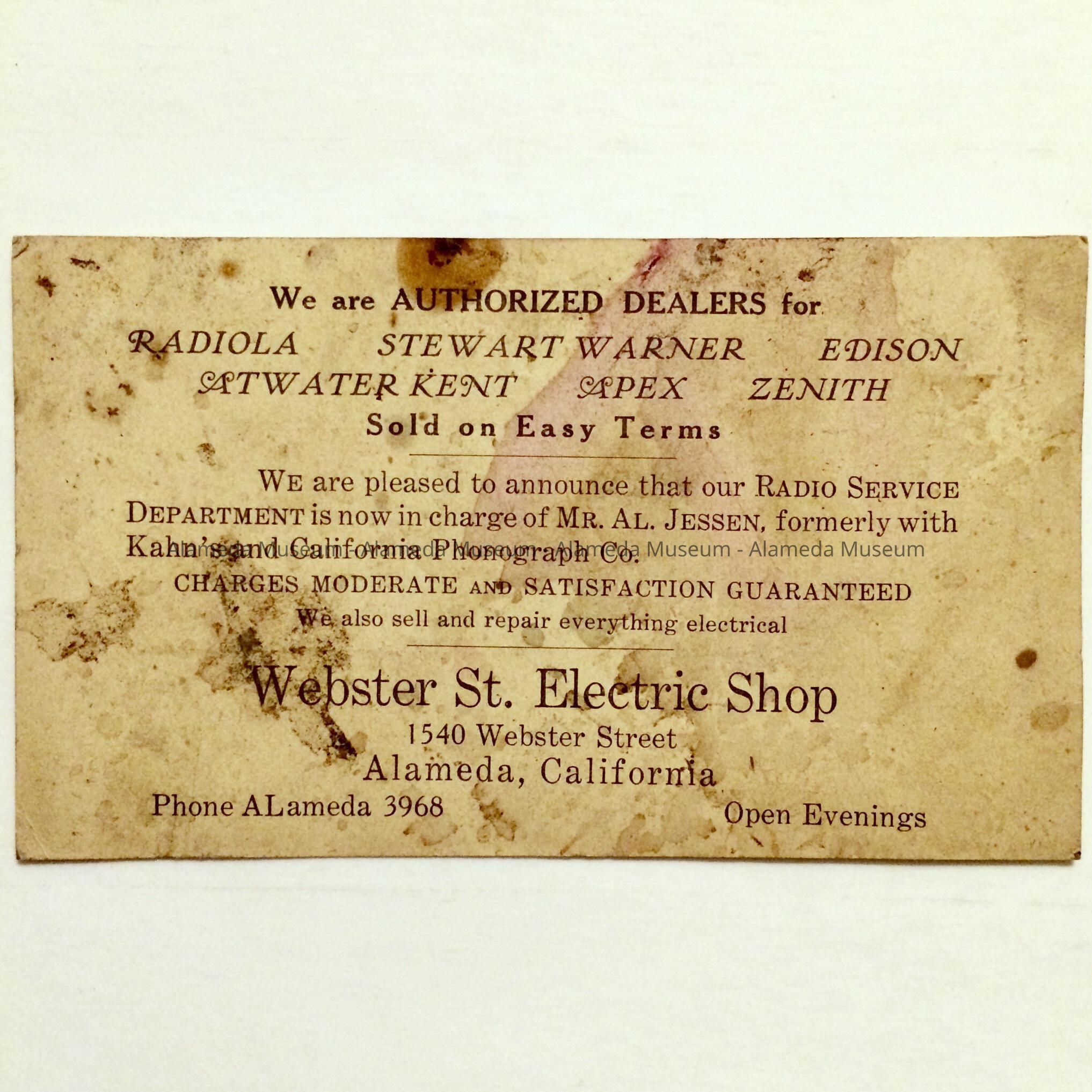 Advertisement card for the Webster St. Electrical Shop, c. 1930sEntry/Object ID