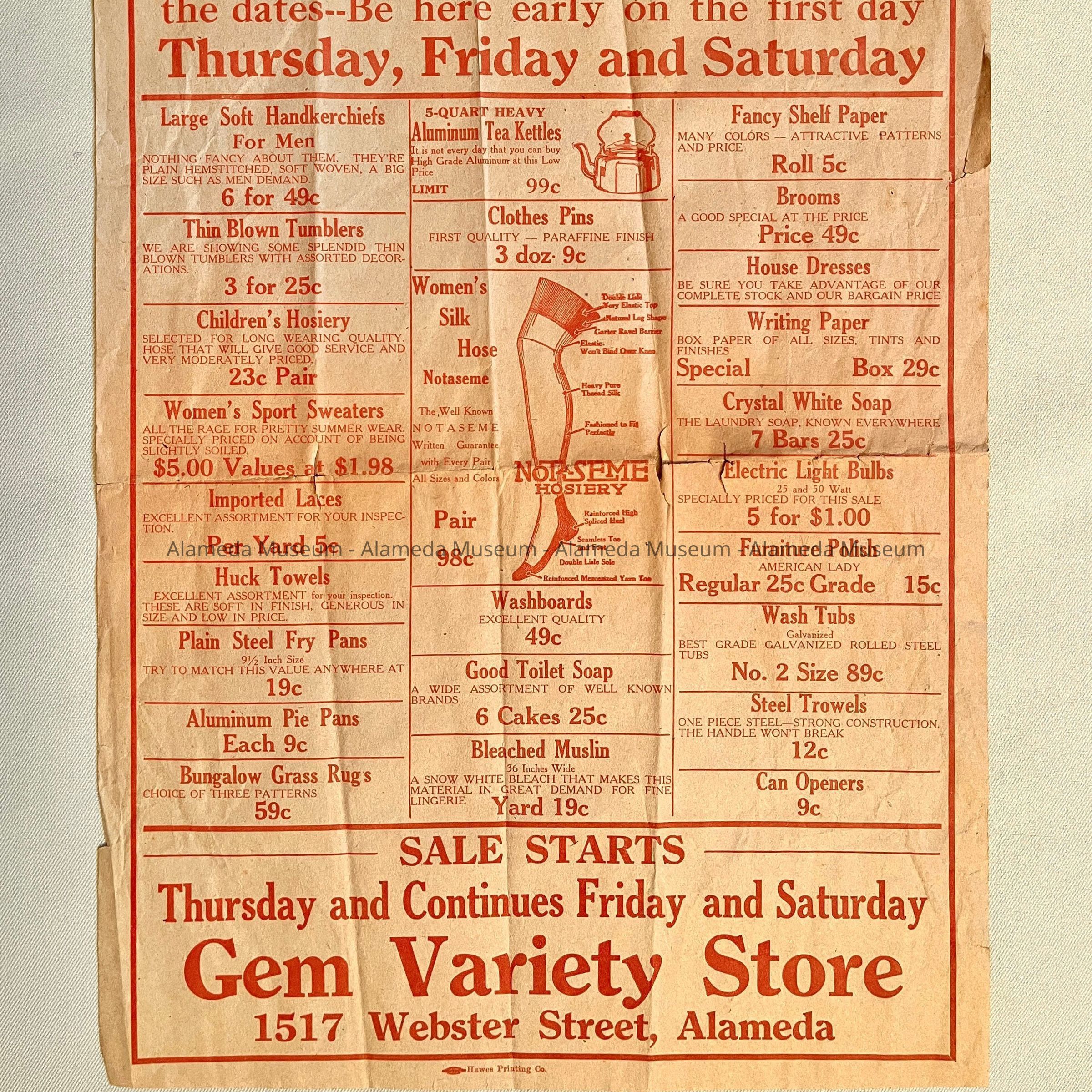 HISTORY OF OBJECT: AN ADVERTISEMENT FOR A SALE OF THE GEM, A VARIETY STORE AT 1517 WEBSTER STREET, ALAMEDA.