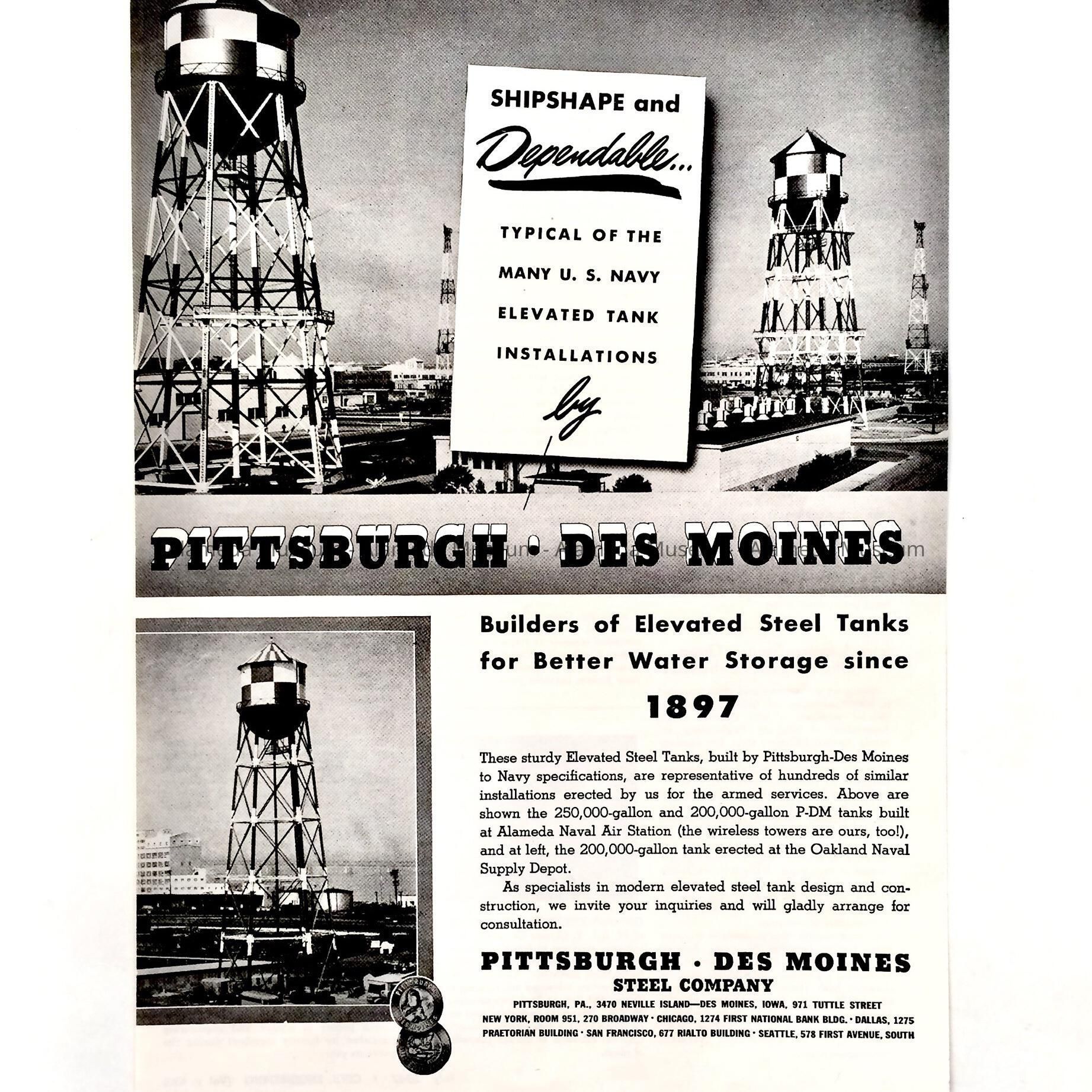 HISTORY OF OBJECT: AN ADVERTISEMENT FOR THE PITTSBURGH--DES MOINES STEEL COMPANY, ILLUSTRATING TANKS BUILT FROM THEIR PRODUCTION AT THE ALAMEDA NAVAL AIR STATION.
