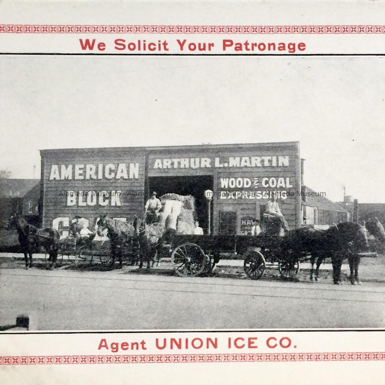 Ink blotter with illustration (exterior of warehouse with horses & wagons) advertising the Arthur L. Martin fuel & feed warehouse, 1316 High Street, Alameda.