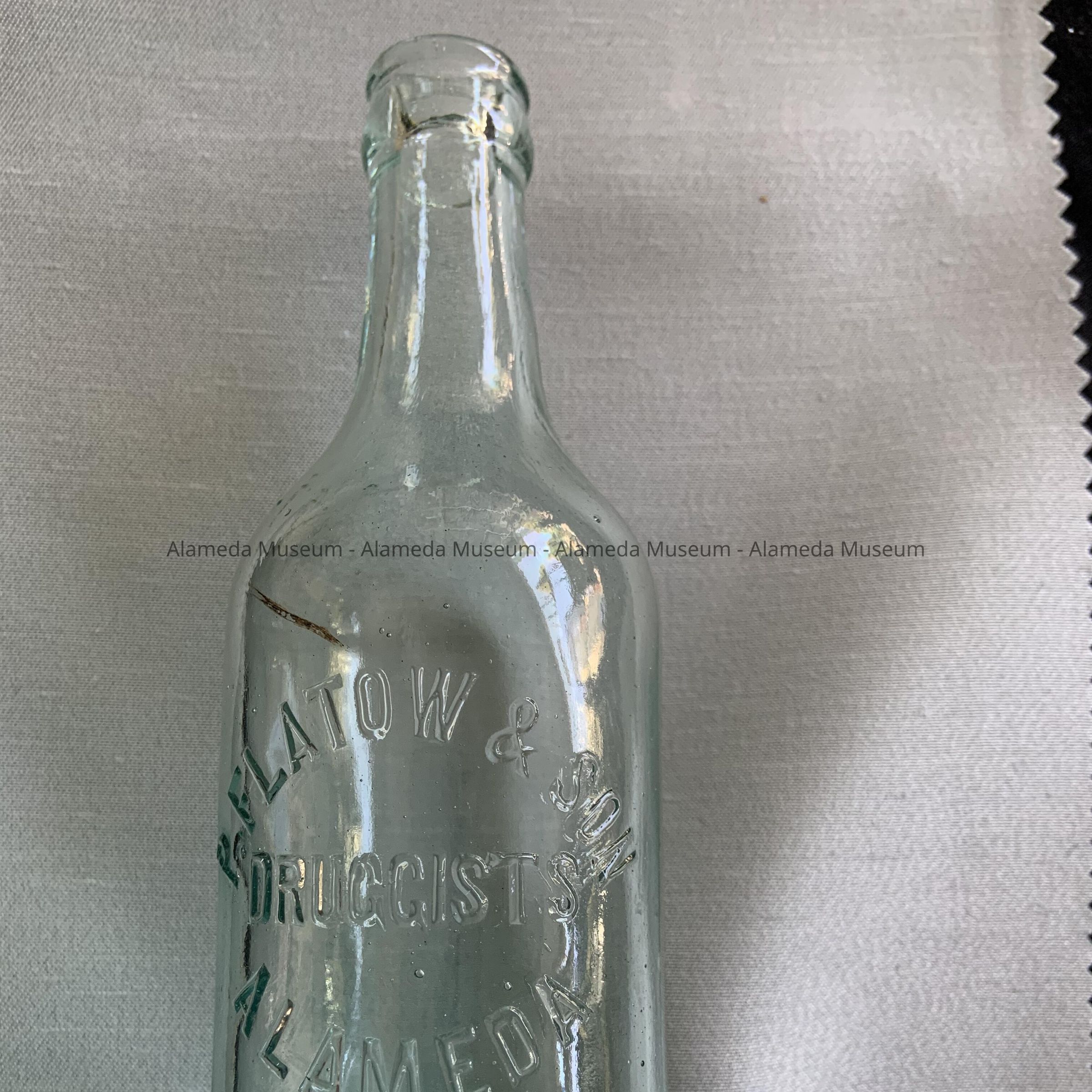 History of Object: Advertising bottle from P. Flatow & Son, druggist, Alameda. (Philip & Irwin P.). The store was located at 1211 Lincoln Ave. Philip's residence was at 1532 Morton St., Irwin's was at 1209B Lincoln Ave. Information from Polk-Husted Alameda City Directory, 1912.