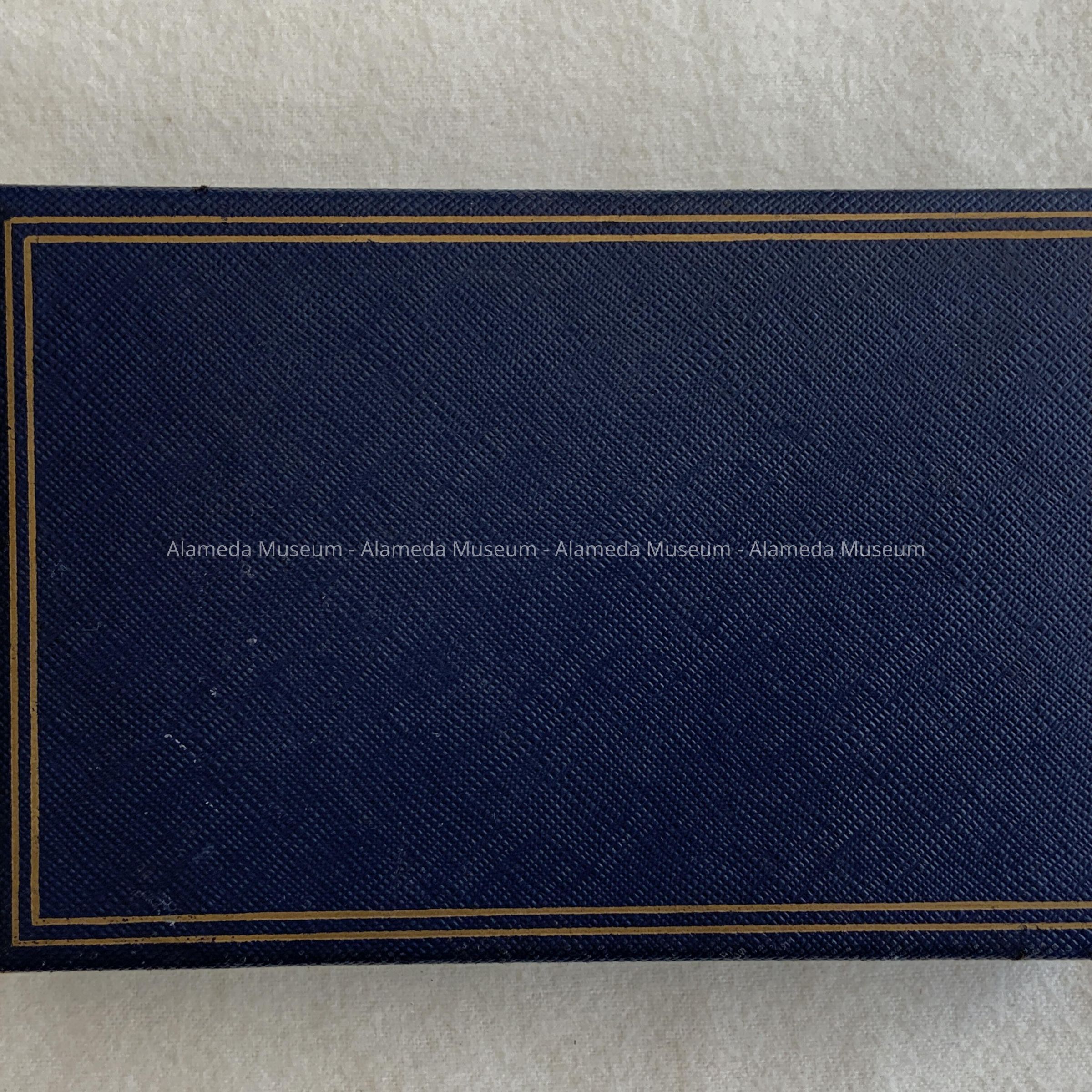 HINGED BOX COVERED IN IMITATION NAVY BLUE-COLORED LEATHER, INCISED WITH GOLD. THE INTERIOR IS SATIN-LINED, WHITE-COLORED AND PALE GREY-COLORED VELVET. INTERIOR OF LID HAS PRINTED MESSAGE IN BLUE-COLORED TYPE.