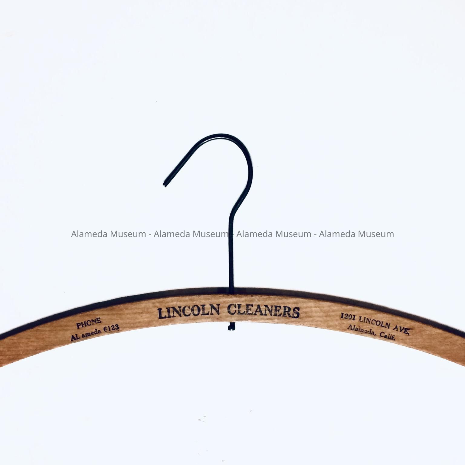 Bow-shaped wooden hanger with attached metal hook. Hanger has bold-printed caption "Lincoln Cleaners" in blue-colored type.