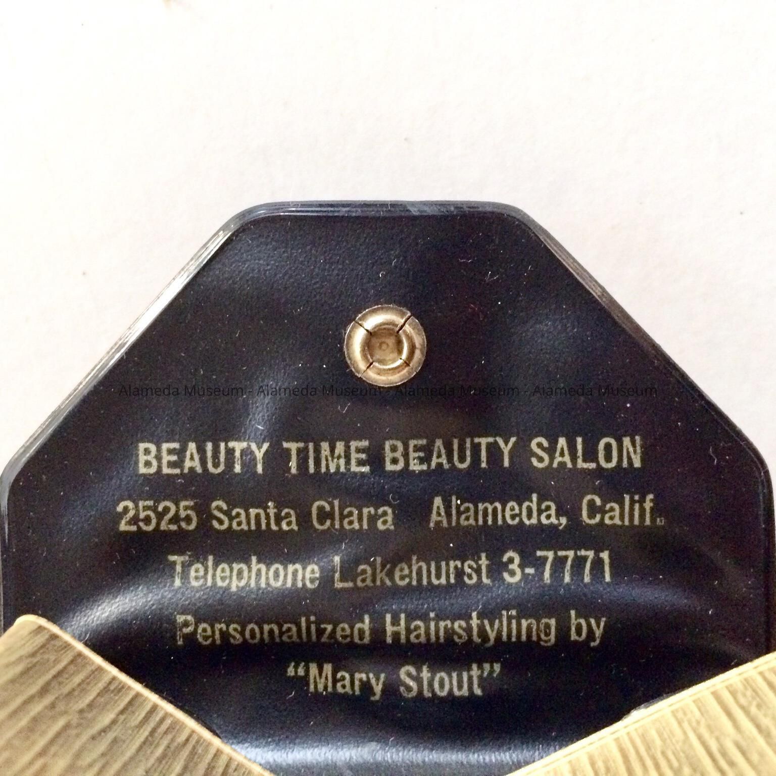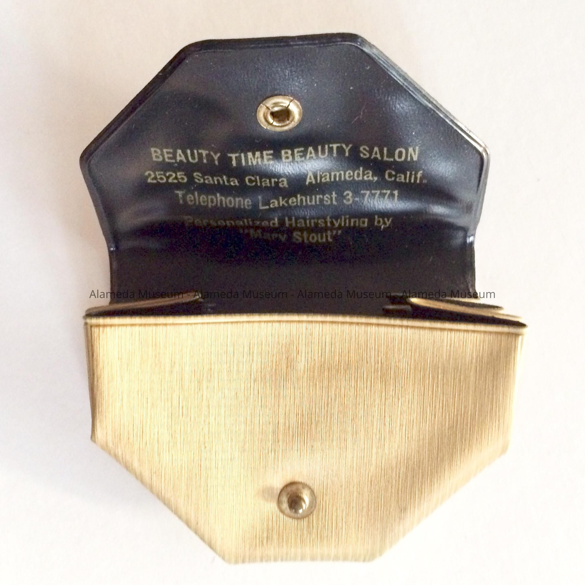 Description: Faux-leather plasticized coin purse with black inside and gold-striped or wood-grain pattern on outside, harmonica-folded sides, and push-button closure. On the inside of the flap is printed: 'Beauty Time Beauty Salon, 2525 Santa Clara, Alameda, Calif., Telephone Lakehurst 3-7771, Personalized Hairstyling by "Mary Stout".