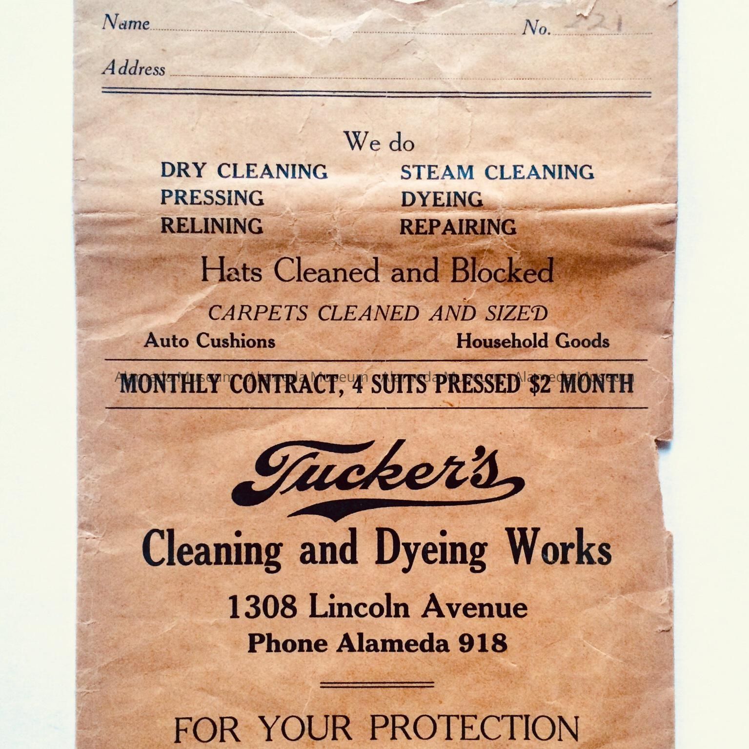 Advertising envelope for Tucker's Cleaning and Dyeing Works, 1308 Lincoln Ave., Alameda. Envelope found among the possessions of Vera George Knox, 2524 Central Ave., Alameda, CA.