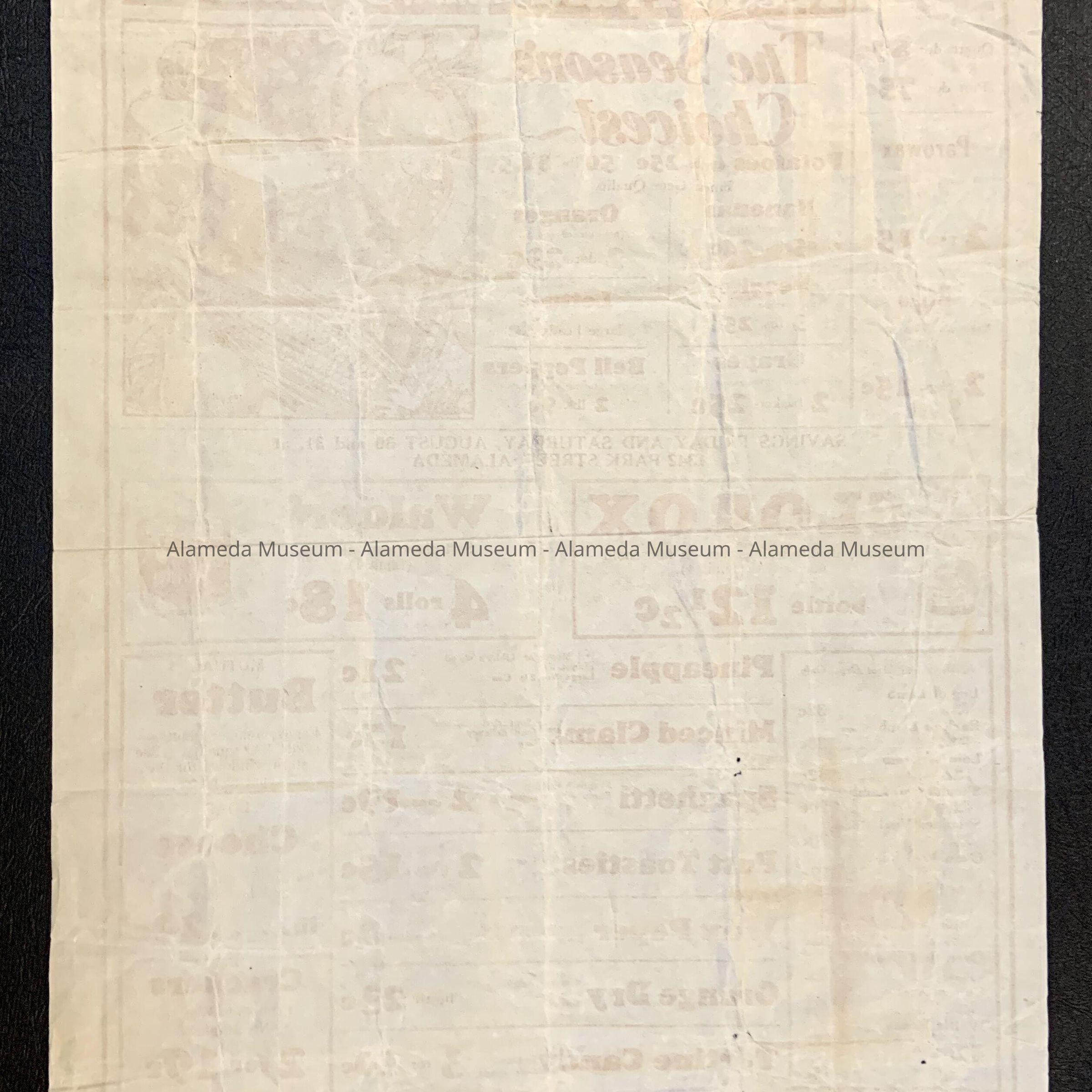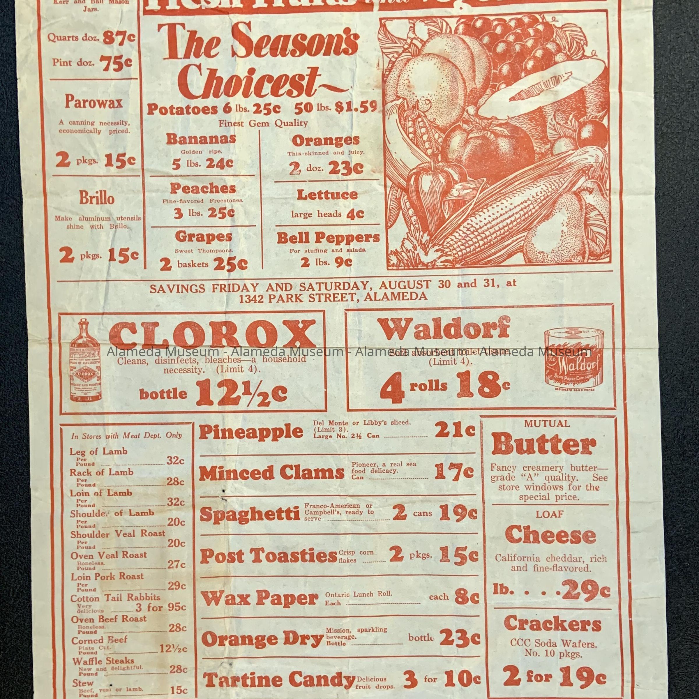History of Object: Advertising flyer for the Mutual Market, 1342 Park Street, Alameda, circa 1930. It lists the current prices prices of produce, can goods, meats, etc. during the Depressione
