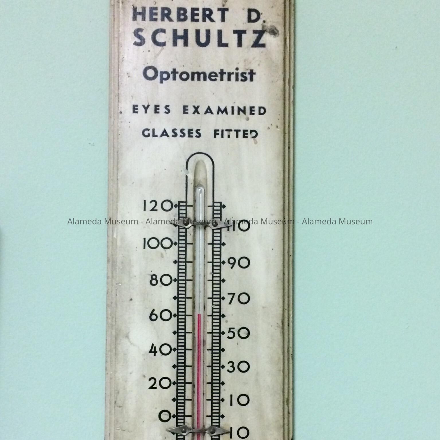 ADVERTISING THERMOMETER FROM HERBERT D SCHULTZ, OPTOMETRIST, 1403 PARK STREET, ALAMEDA, CALIFORNIA. THE ITEM BELONGED TO FRED W KRUEGER, FATHER OF THE DONOR.