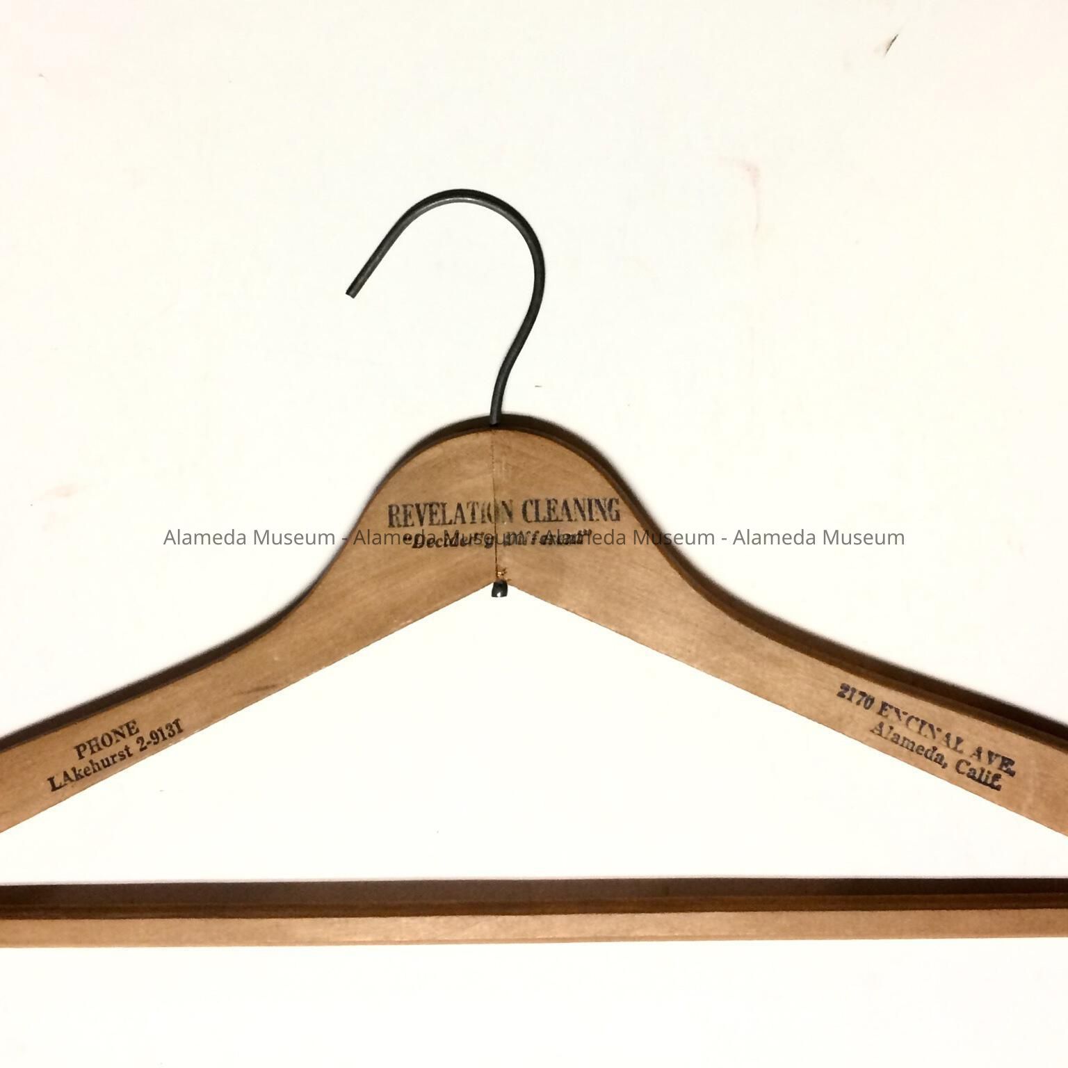 ADVERTISING HANGER FROM "REVELATION CLEANERS, 2170 ENCINAL AVENUE, ALAMEDA. TELEPHONE: LAkehurst 1-9131.".