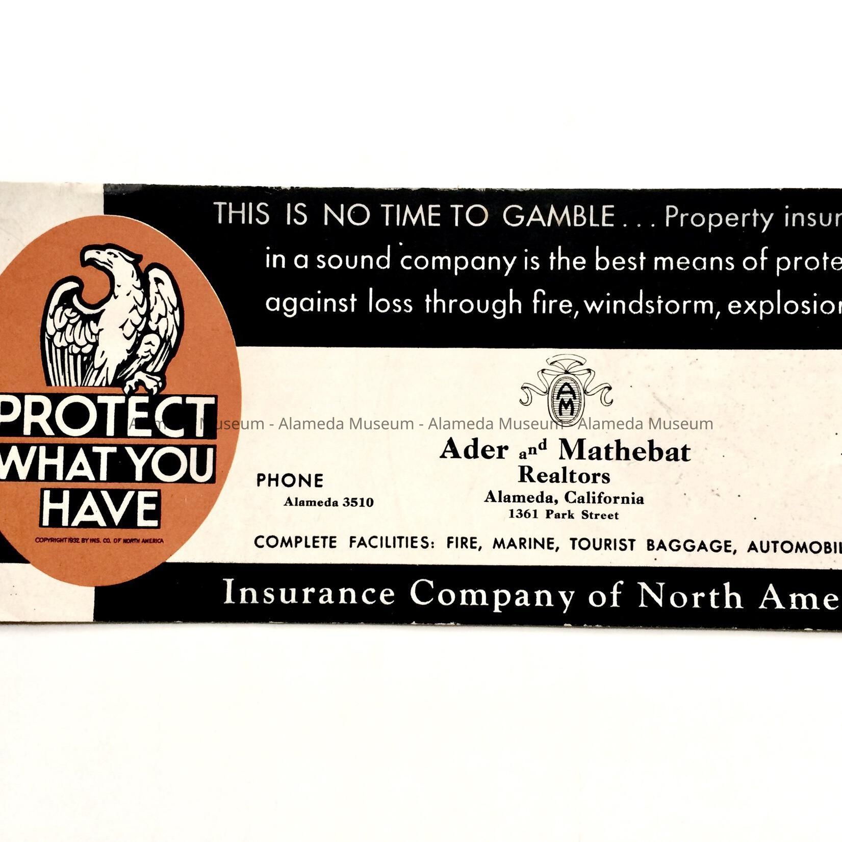 HISTORY OF OBJECT: AN ADVERTISING INK BLOTTER FOR THE INSURANCE COMPANY OF NORTH AMERICA, AGENTS ADER AND MATHEBAT, REALTORS, 1361 PARK STREET, ALAMEDA.