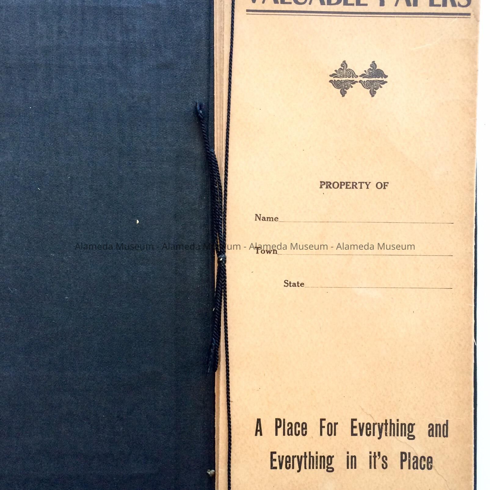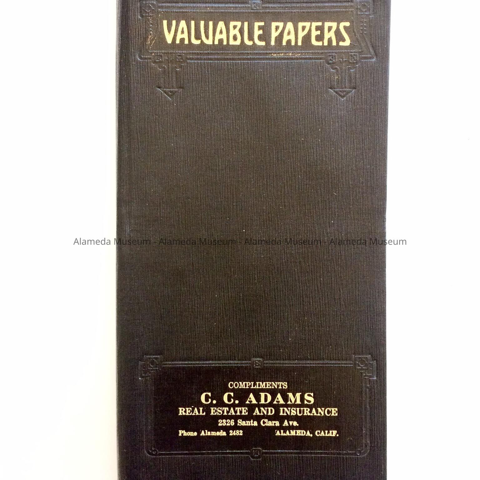 Description: Immitation black leather covered letter file with caption on upper part of cover in incised letters in gold "Valuable Papers," and in lower section of cover (gold) "Compliments C. C. Adams, real estate and insurance, 2326 Santa Clara Ave., Alameda, Calif, Phone Alameda 2482". Interior of file is lined with black material and contains 8 separate tan colored envelopes with individual headings such as "Valuable Papers", Business Memoranda and Clippings, etc. The envelopes are held into place by a black string which acts as the binding.