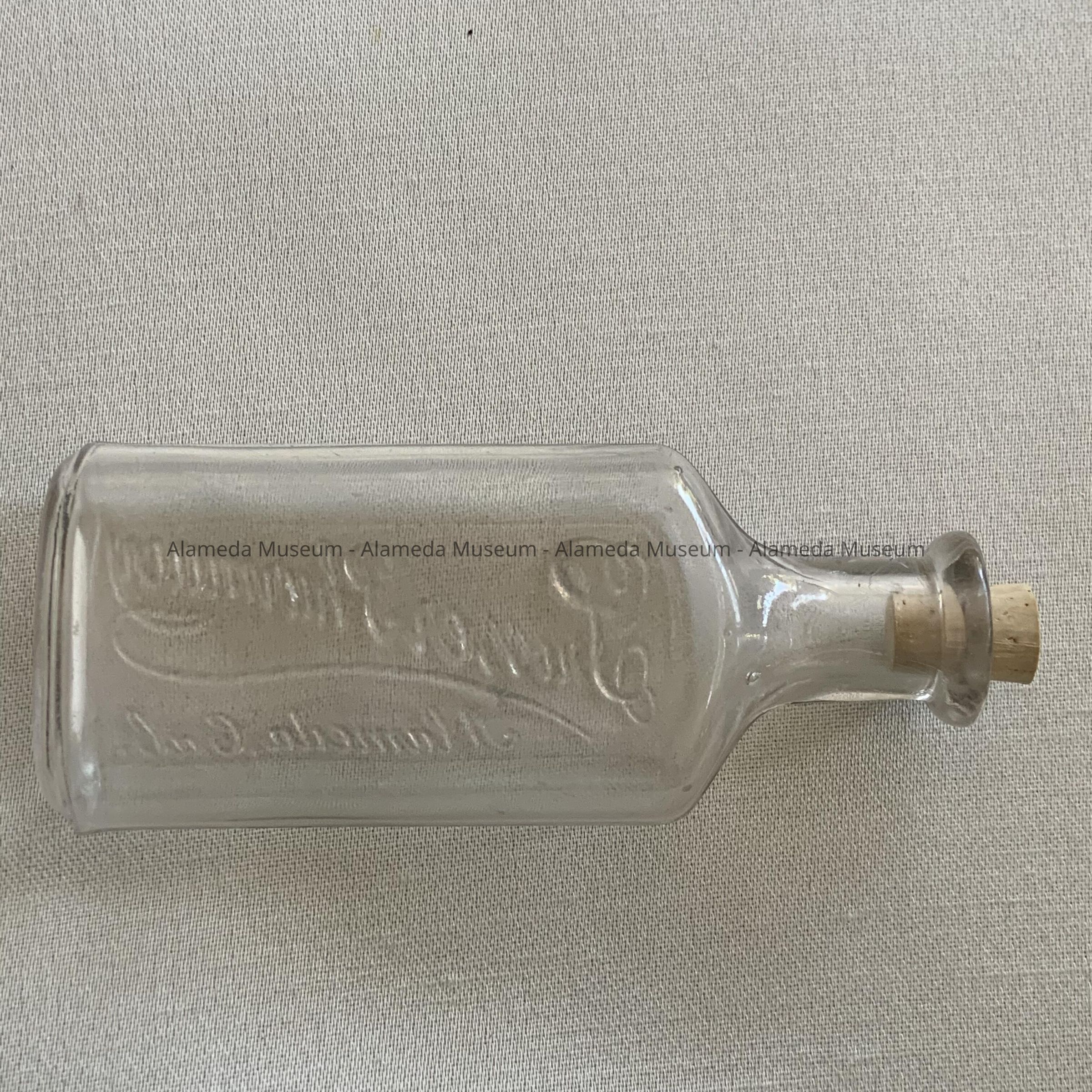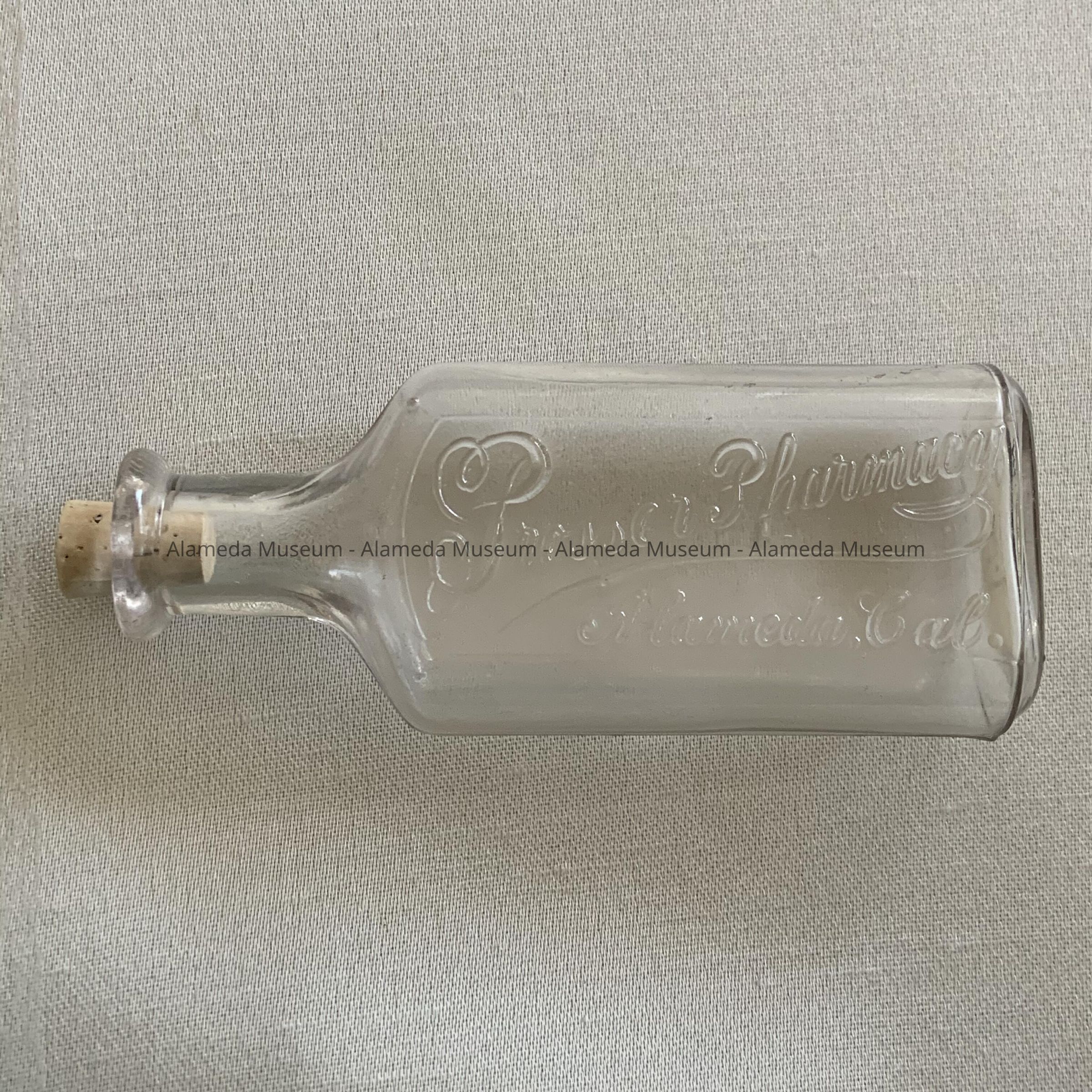Clear glass, double seam, medicine bottle with embossed label stating "Prosser Pharmacy, Alameda, Cal" with cork stopper.