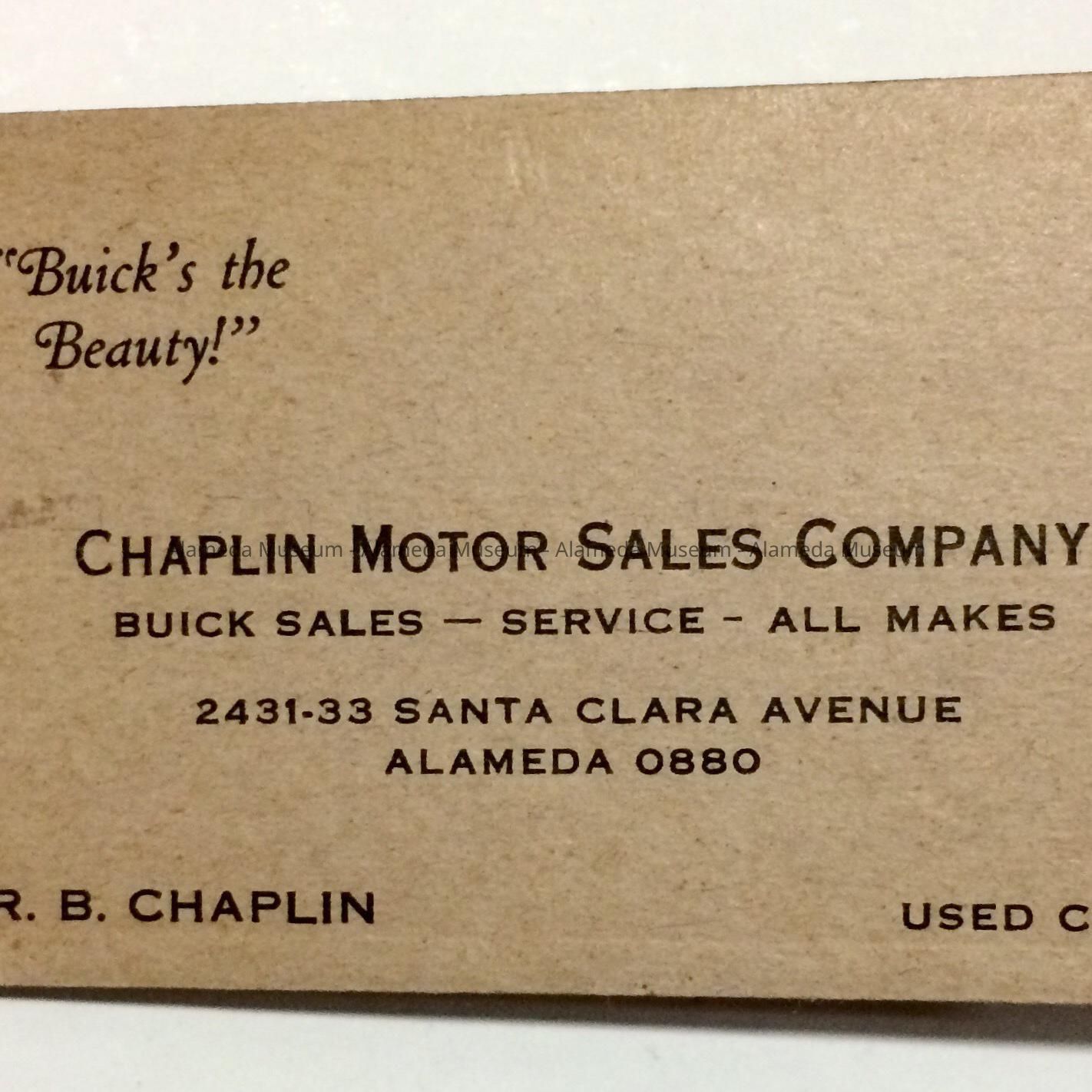 History of Object: Advertising memo pad for Chaplin Motor Sales Company, Buick sales, service, 2131-33 Santa Clara Avenue, Alameda 0880, R. B. Chaplin, owner.