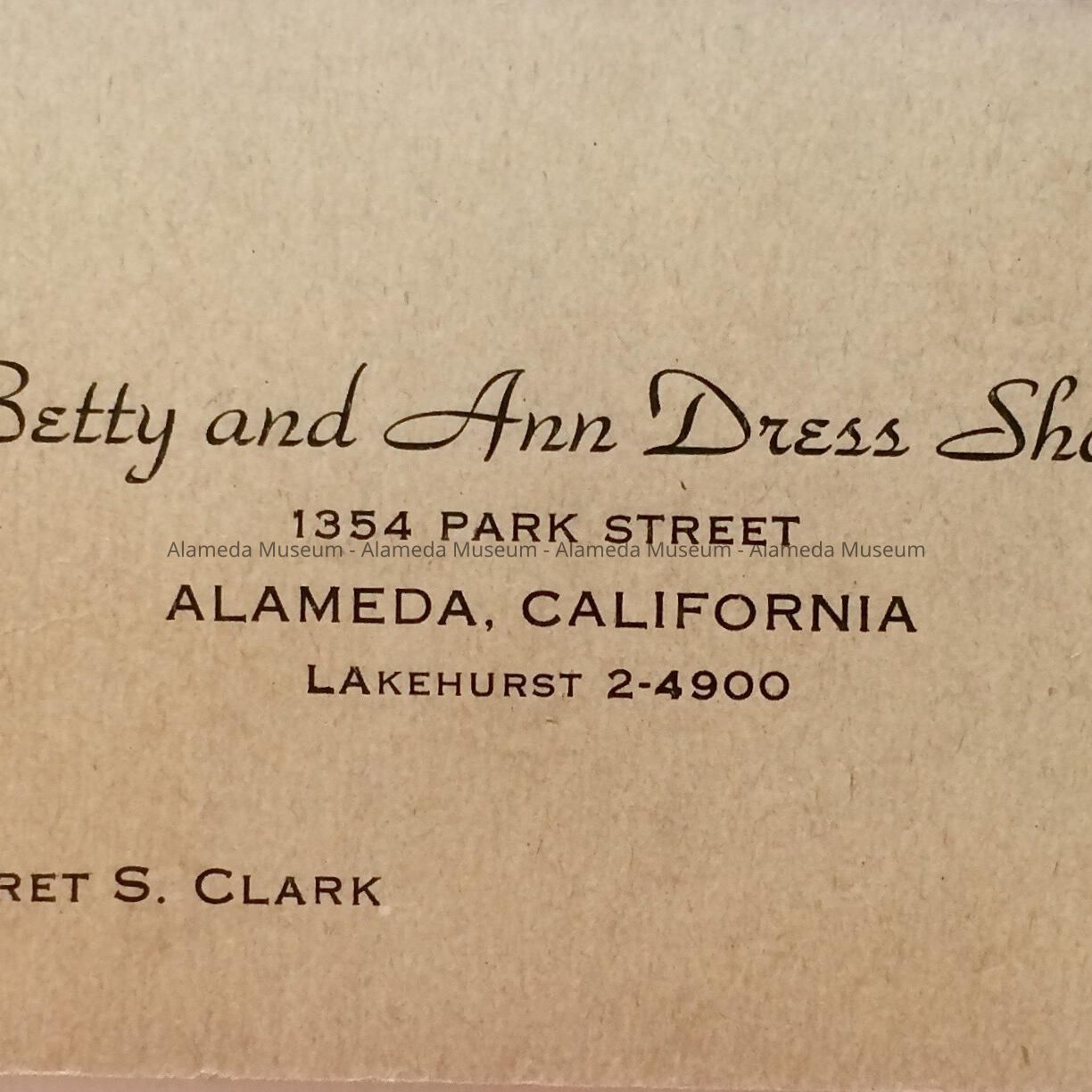 HISTORY OF OBJECT: ADVERTISING NOTEBOOK GIVEN TO CUSTOMERS BY THE "BETTY AND ANN DRESS SHOP, 1354 PARK STREET, ALAMEDA, CALIFORNIA; TELEPHONE: LA 2-4900," DATED 1945-1946.'