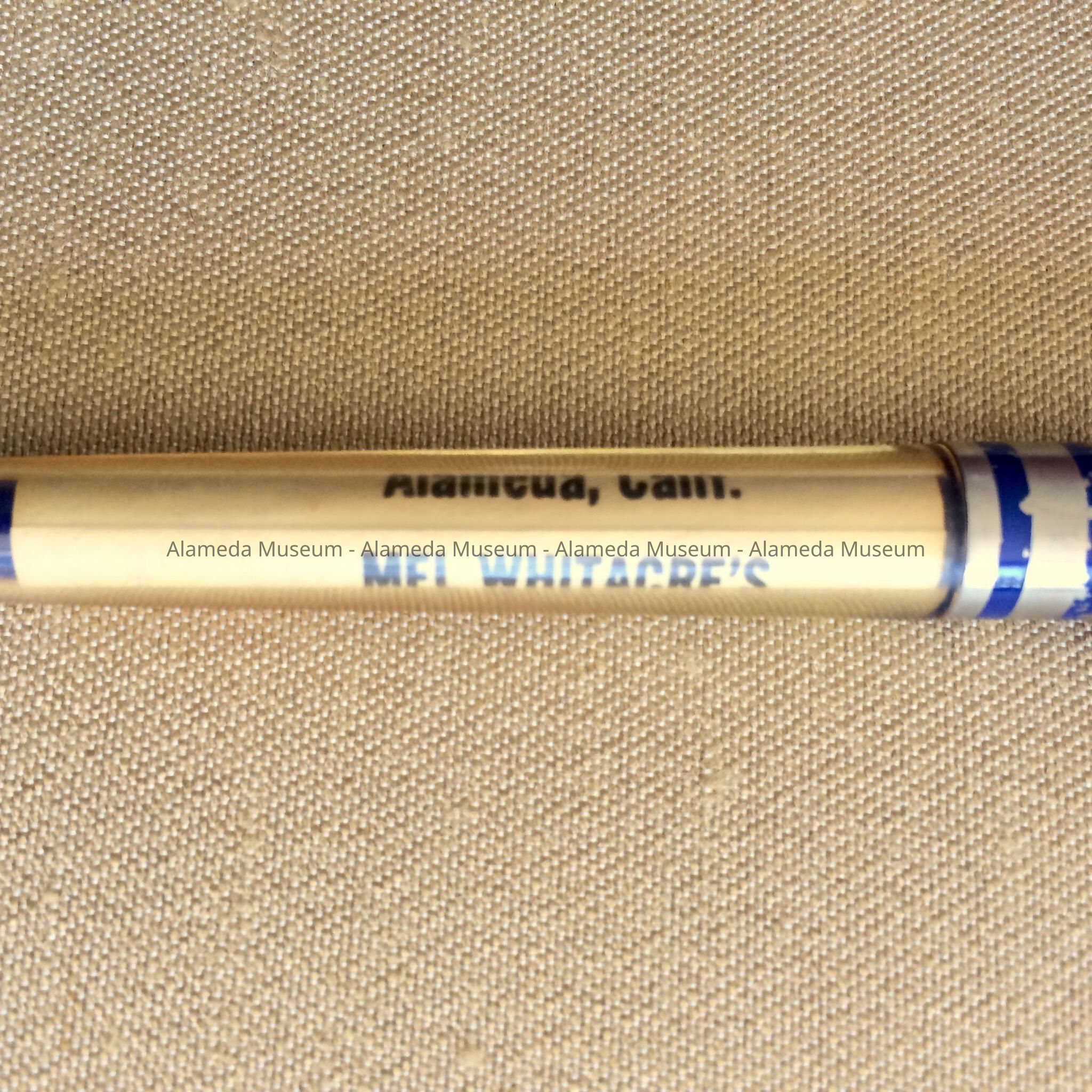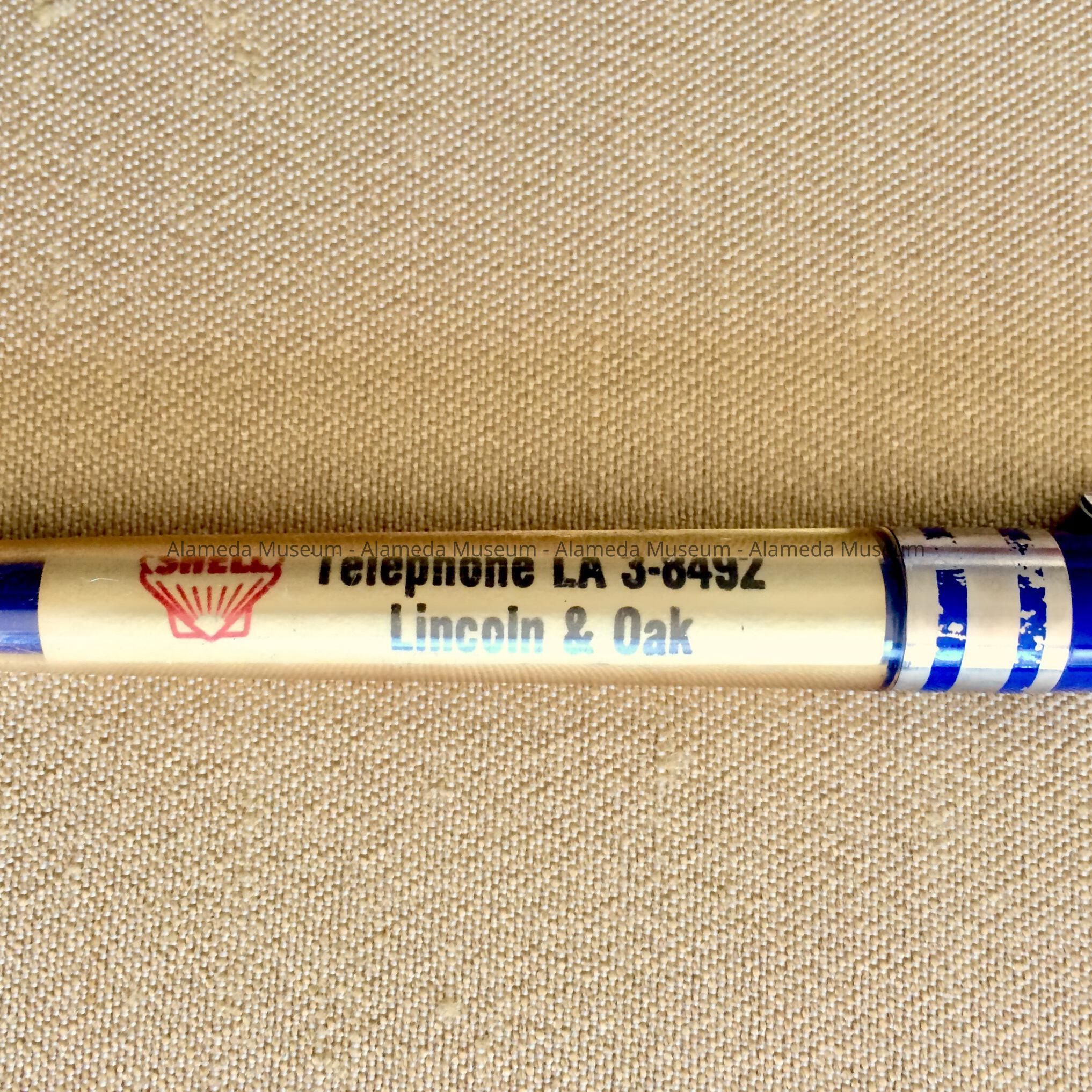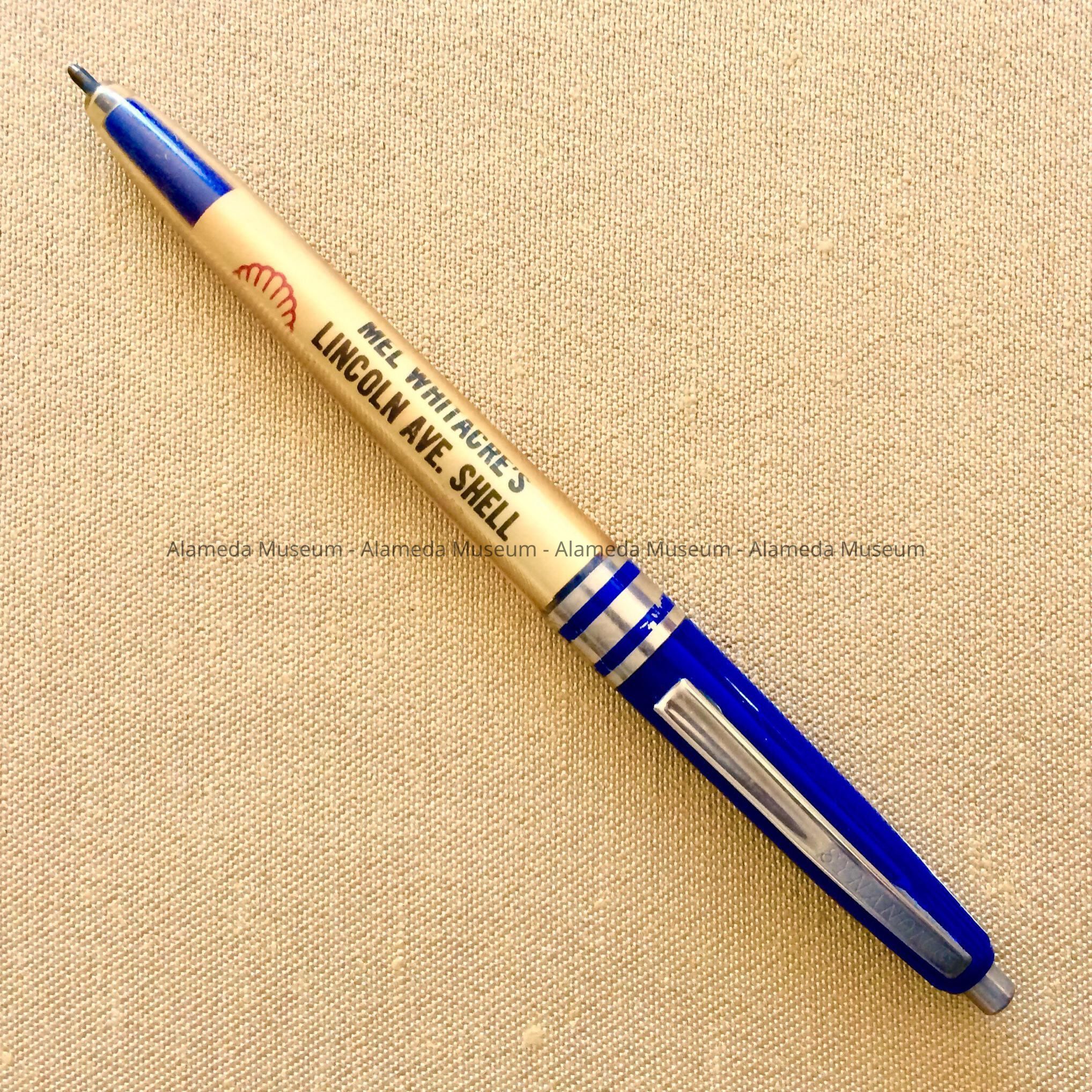 HISTORY OF OBJECT: PEN ADVERTISING, "MEL WHITACRE'S LINCOLN AVENUE SHELL STATION, LINCOLN AVENUE AND OAK STREETS, ALAMEDA." TELEPHONE: LA 3-8492.
