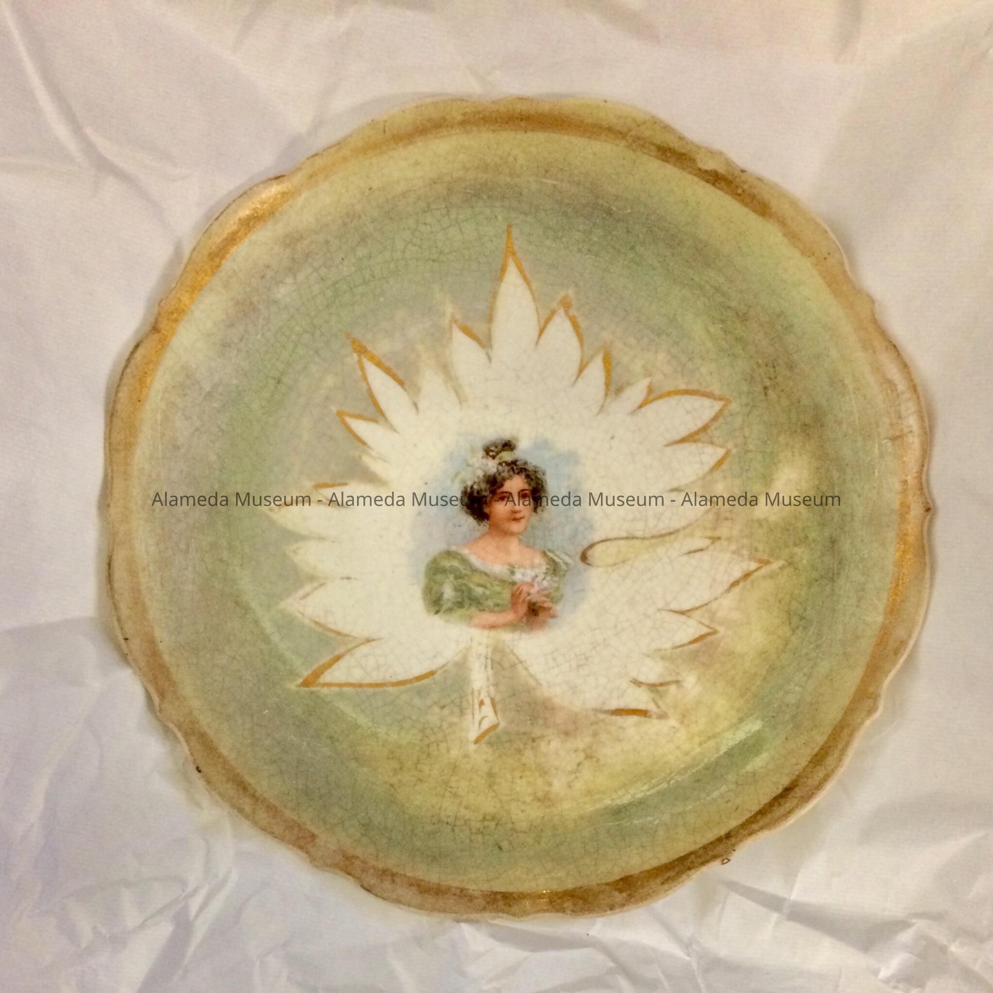 Description: Semi-porcelain plate with decal portrait of lady placed in central section of a leaf. The leaf is white, outlined in gold, which rests on a shaded green background. On the reverse side of the plate it states in gold "Compliments of J. S. Crawford & Co., Alameda, Call".