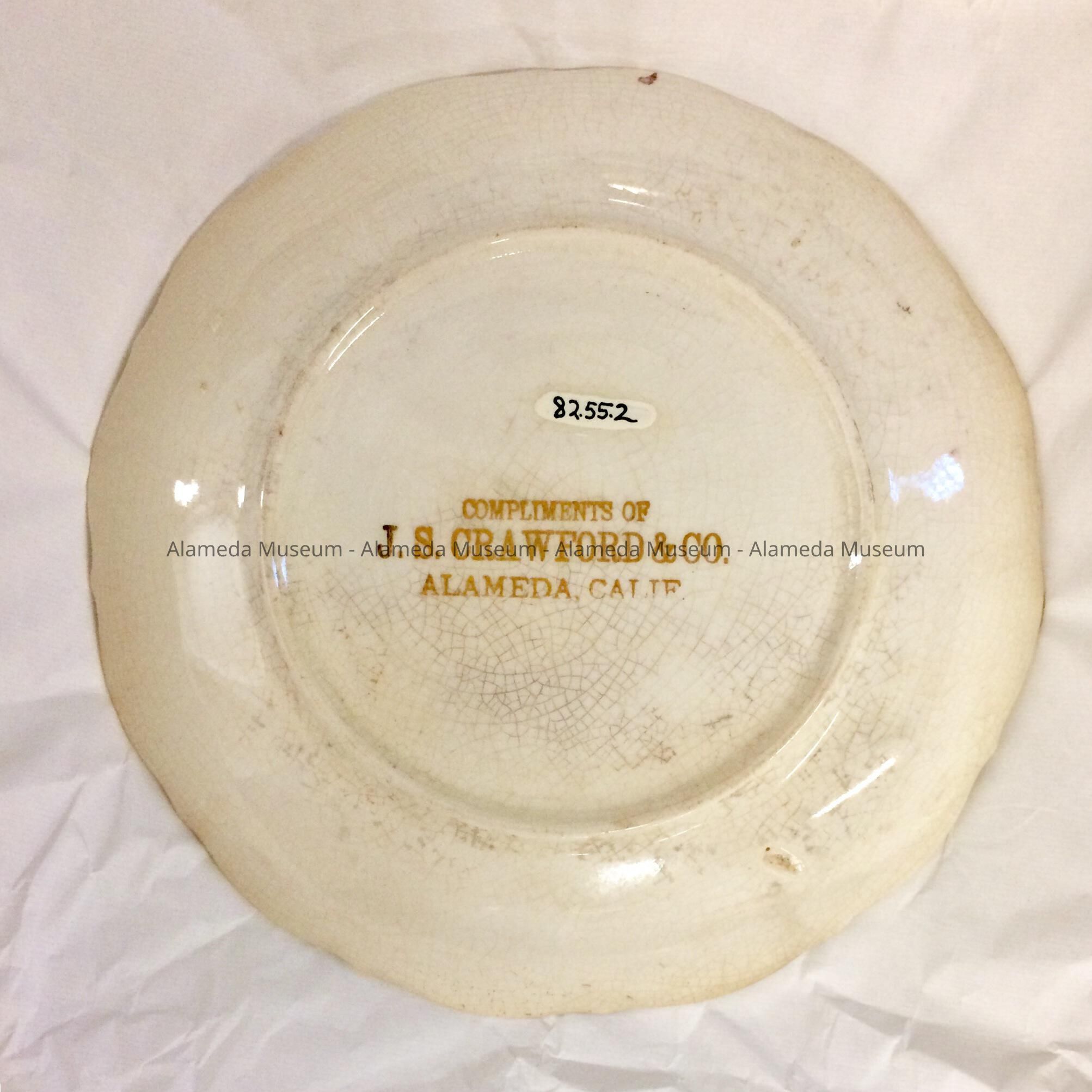 History of Object: Advertising premium plate for J. S. Crawford . Co., Lincoln Avenue, at Bay Station, Alameda, an early grocery store of the 1900's.