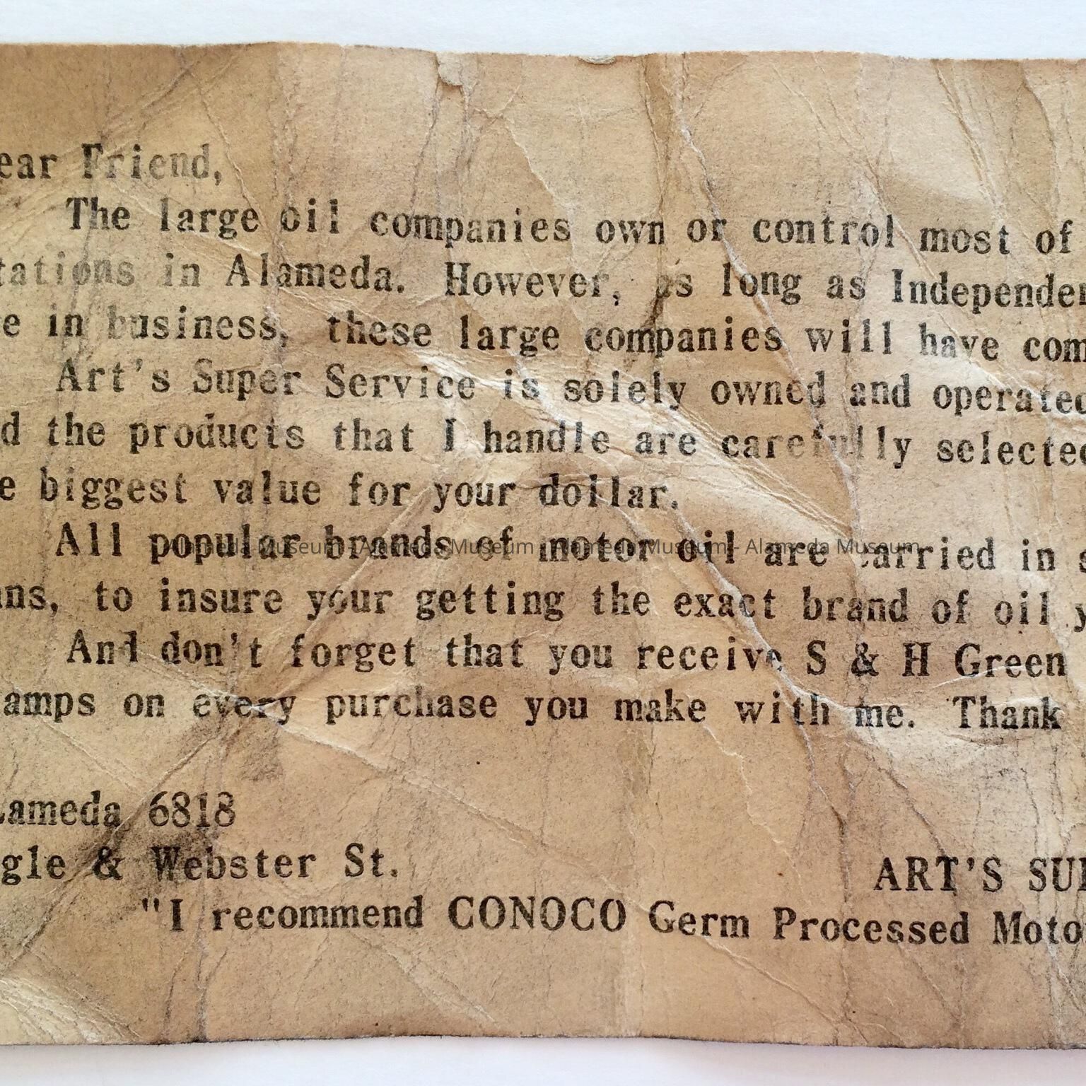 Advertising Postal Card from Art's Super Service, 1934Entry/Object ID