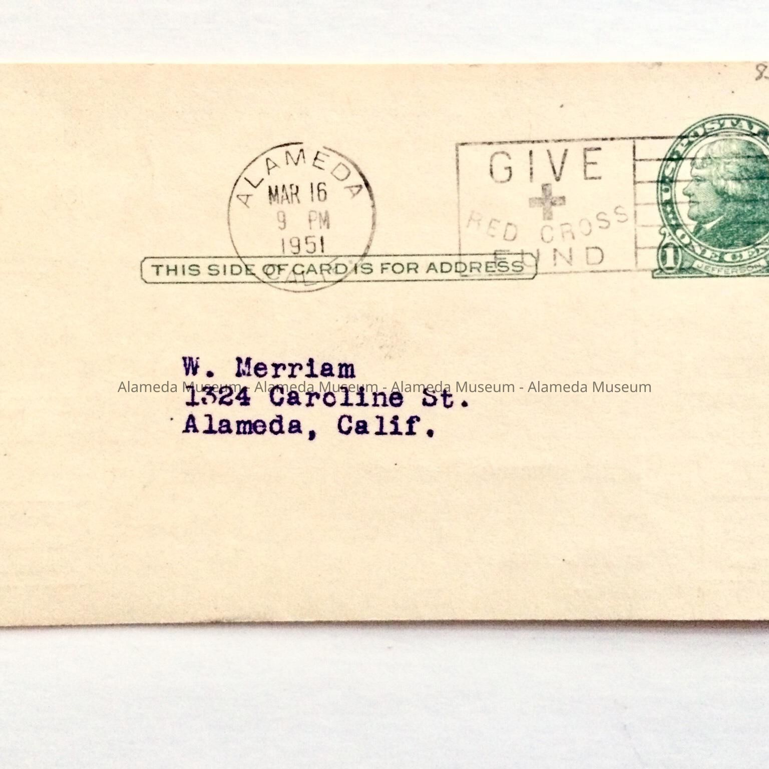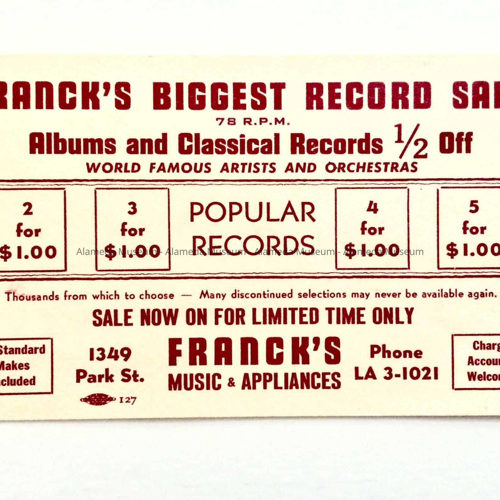 History of Object: Post card (advertising), from Franck's Music & Appliances, 1349 Park St, Alameda, and sent to W. Merriam, 1324 Caroline St., Alameda, Ca., Mar 16, 1951.