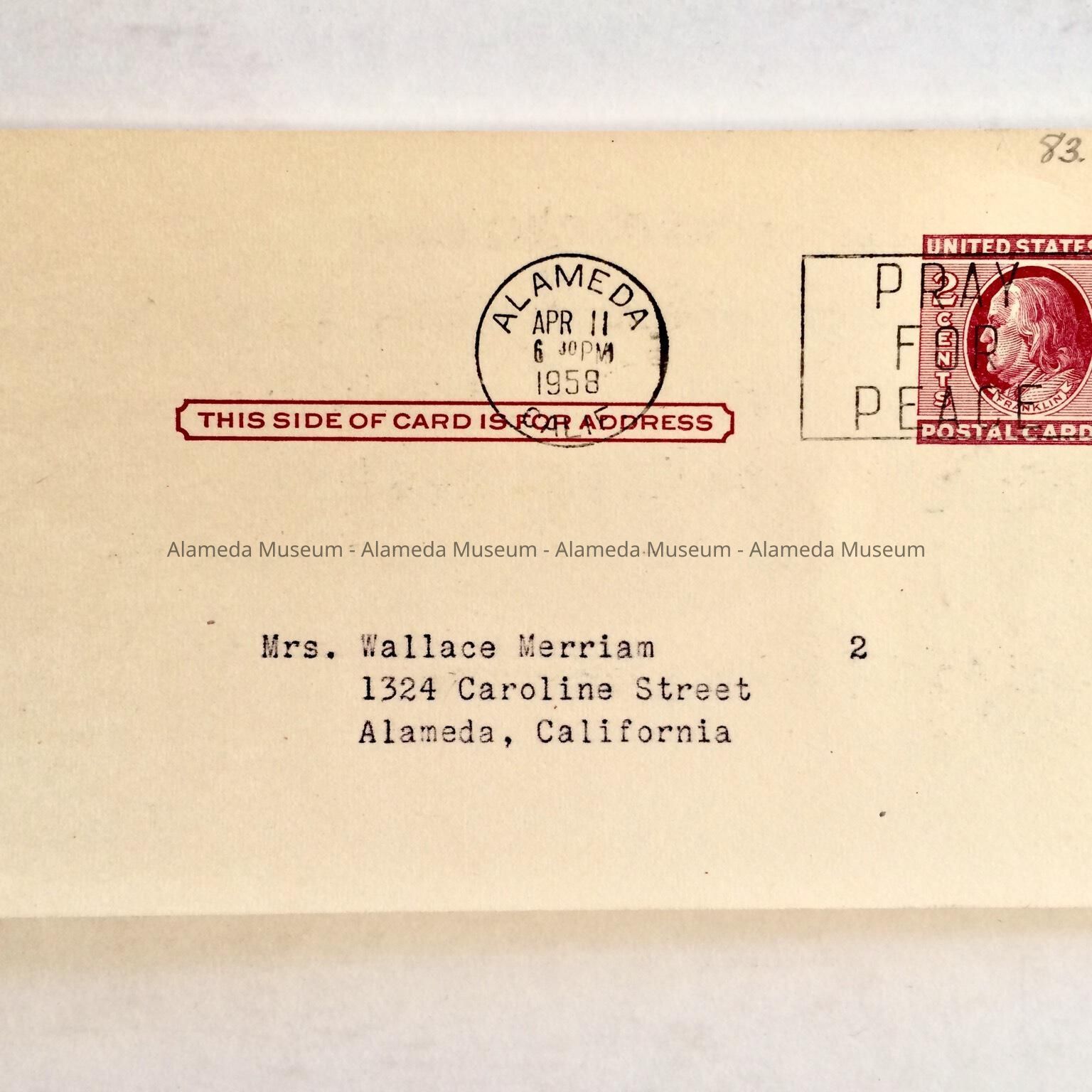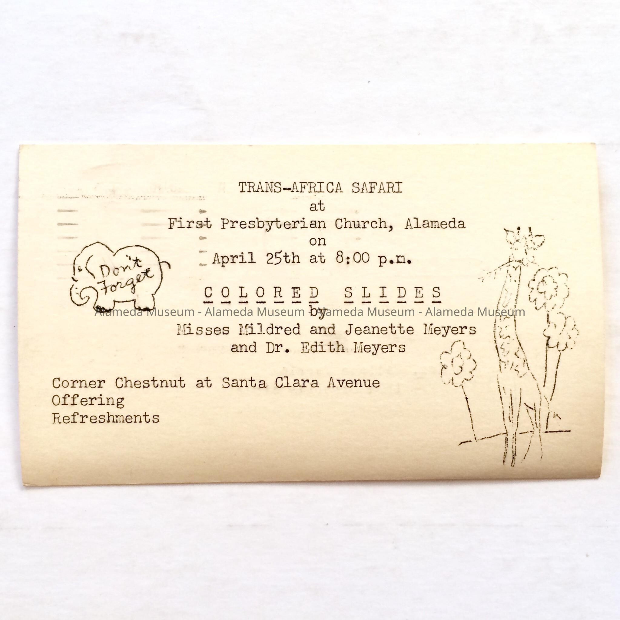 History of Object: Post card (advertising), announcing film presentation "Trans-Africa Safari", to be given by the Meyers sisters, at the First Presbyterian Church, corner Santa Clara Ave., & Chestnut Street, April 25, 1958. Sent to Mrs. Wallace Merriam, 1324 Caroline St., Alameda, Ca.