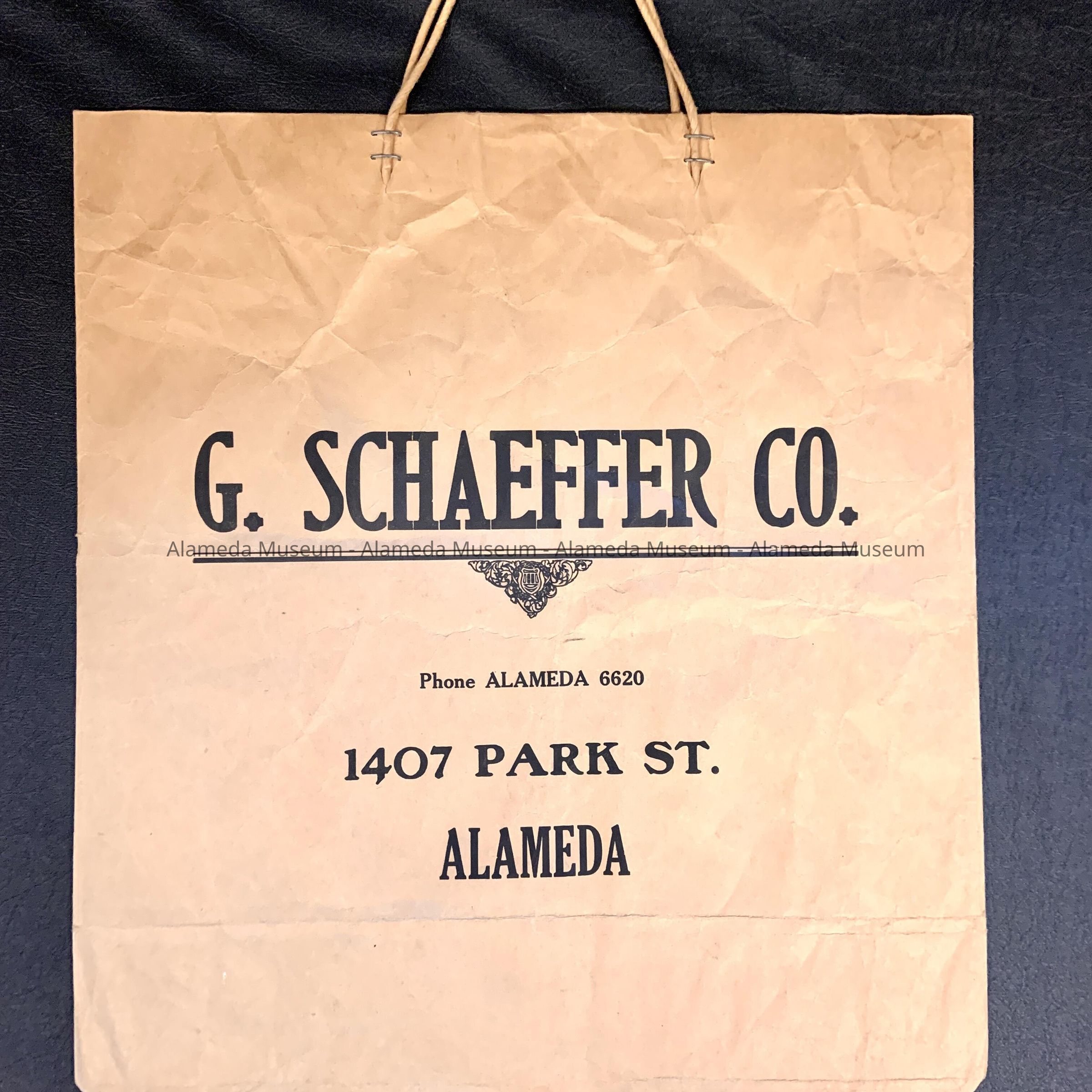 A MANILA-COLORED SHOPPING BAG, MADE OF HEAVY KRAFT STYLE PAPER, WITH STAPLED STRETCH HANDLES ON BOTH SIDES. BAG HAS A PRINTED CAPTION, "G SCHAEFFER CO., 1407 PARK STREET, ALAMEDA; TELEPHONE AL 6620."