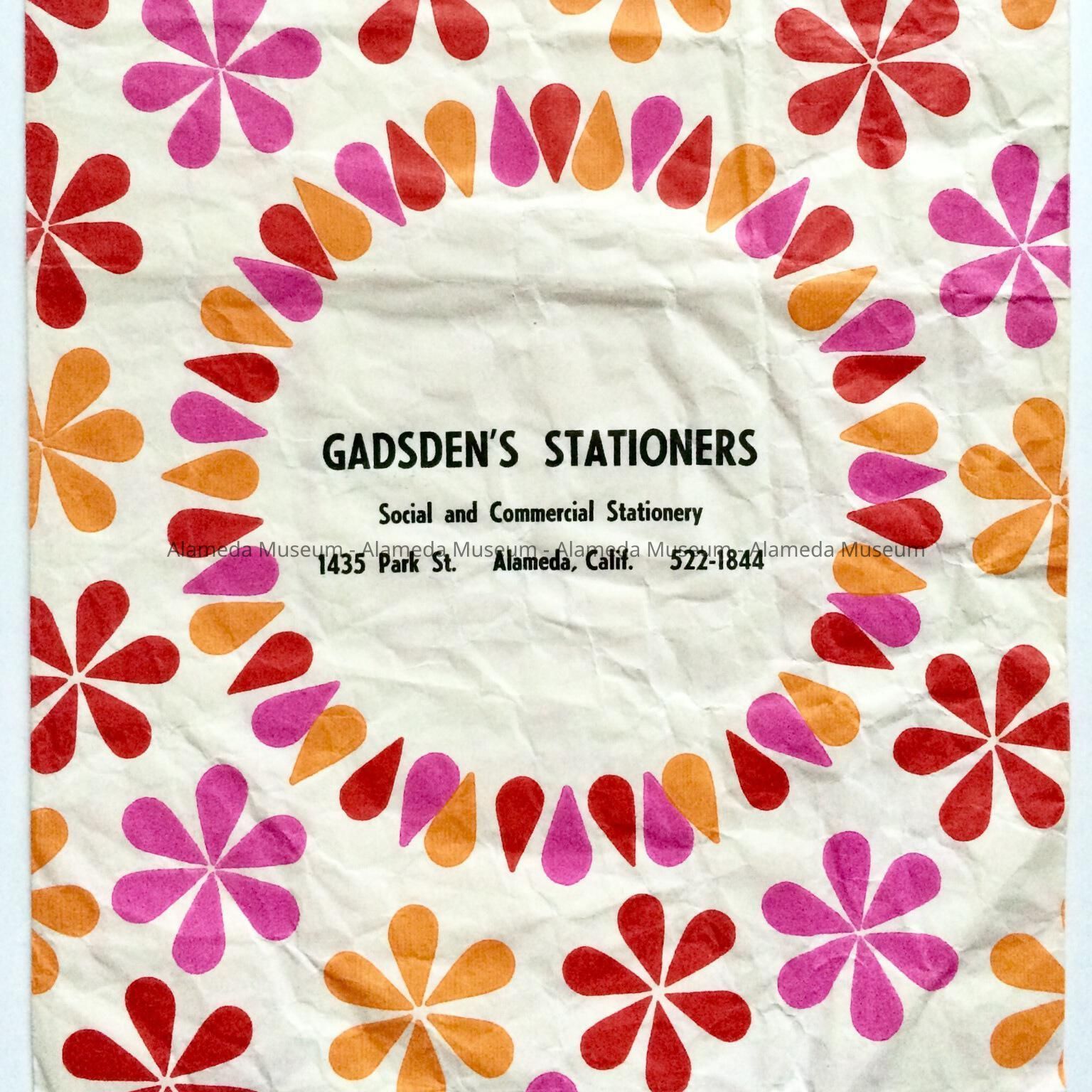 PAPER BAG, WITH STYLIZED FLORAL PATTERN IN RED, ORANGE, AND PINK COLORS ON A WHITE-COLORED BACKGROUND. BAG HAS BOLD-PRINTED CAPTION, "GADSDEN'S STATIONERS".