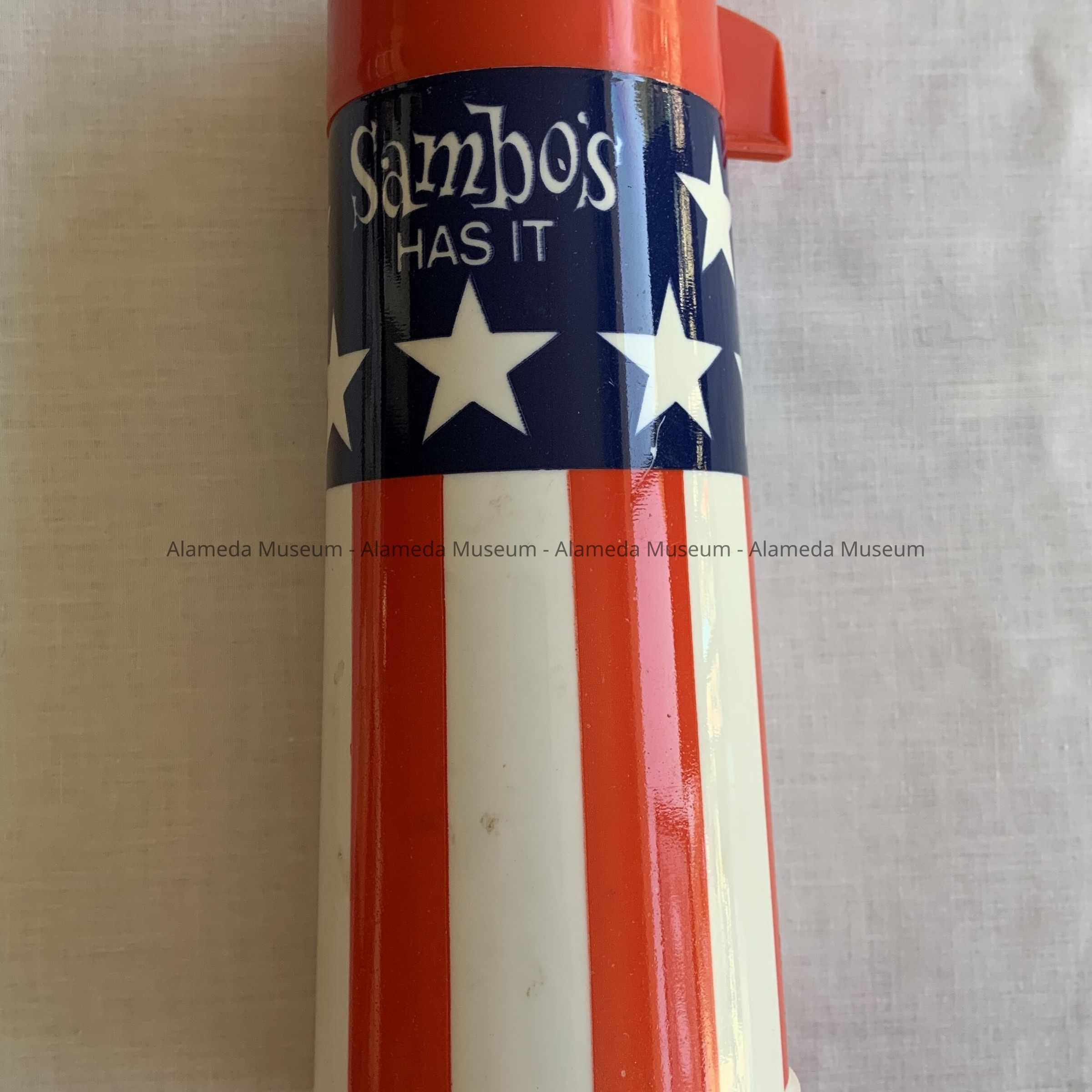 History of Object: a thermos bottle sold as an advertising promotion at Sambo's Restaurant, 1919 Webster St., Alameda. Part of the collection of the late Samuel Purdy, an original employee of the Alameda restaurant.