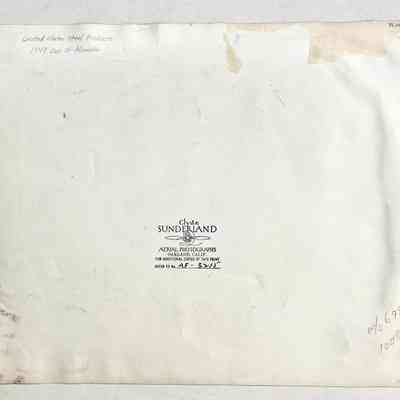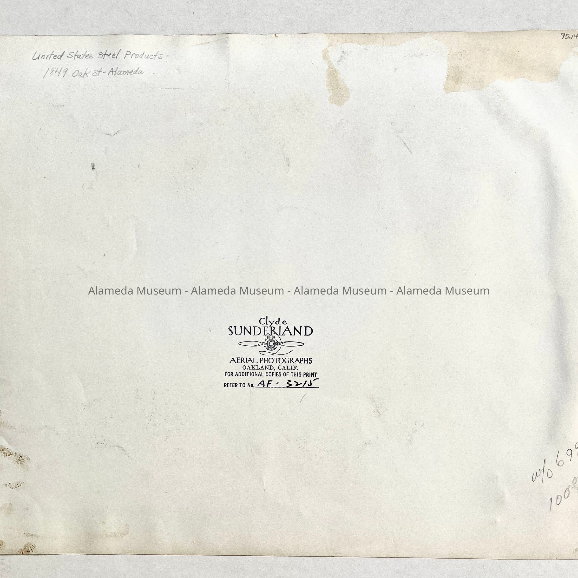 A. BLACK AND WHITE GLOSSY PHOTOGRAPH, UNMOUNTED; SIGNED ON LOWER LEFT-HAND CORNER, "CLYDE SUNDERLAND." ON REVERSE SIDE IS AN ADDITIONAL SIGNATURE, INCLUDING AERIAL PHOTOGRAPHS, OAKLAND, CALIFORNIA.