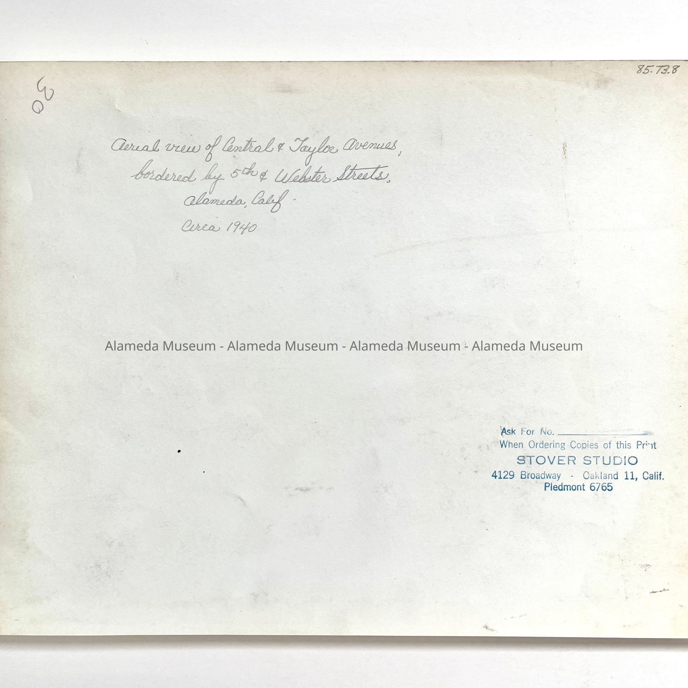 History of Object: Aerial photo of Central & Taylor Avenues, bordered approximately by Webster & 5th Streets, Alameda.
