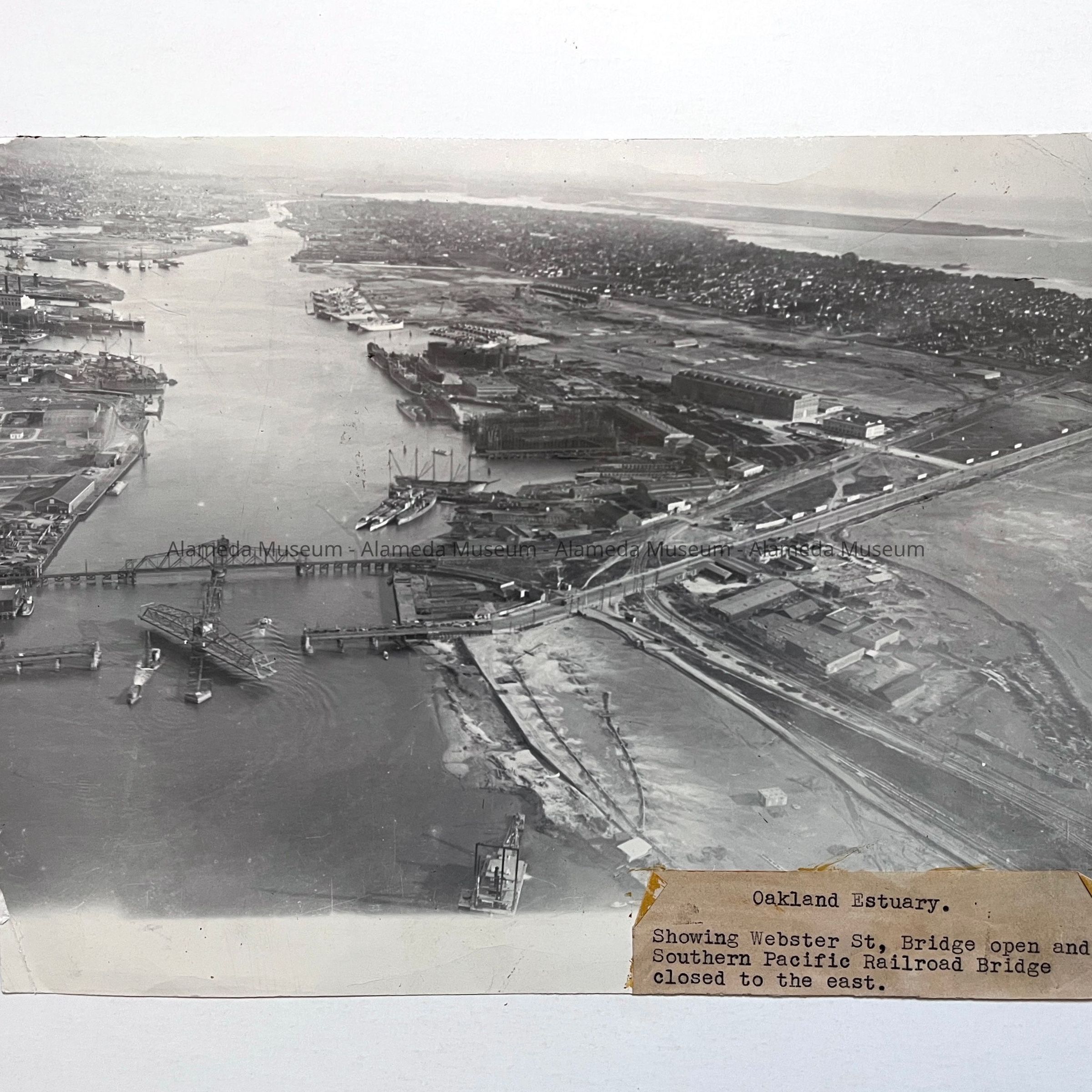 History of Object: Aerial view of the Oakland estuary showing Webster Street Bridge open and the Southern Pacific Railroad Bridge closed to traffic.