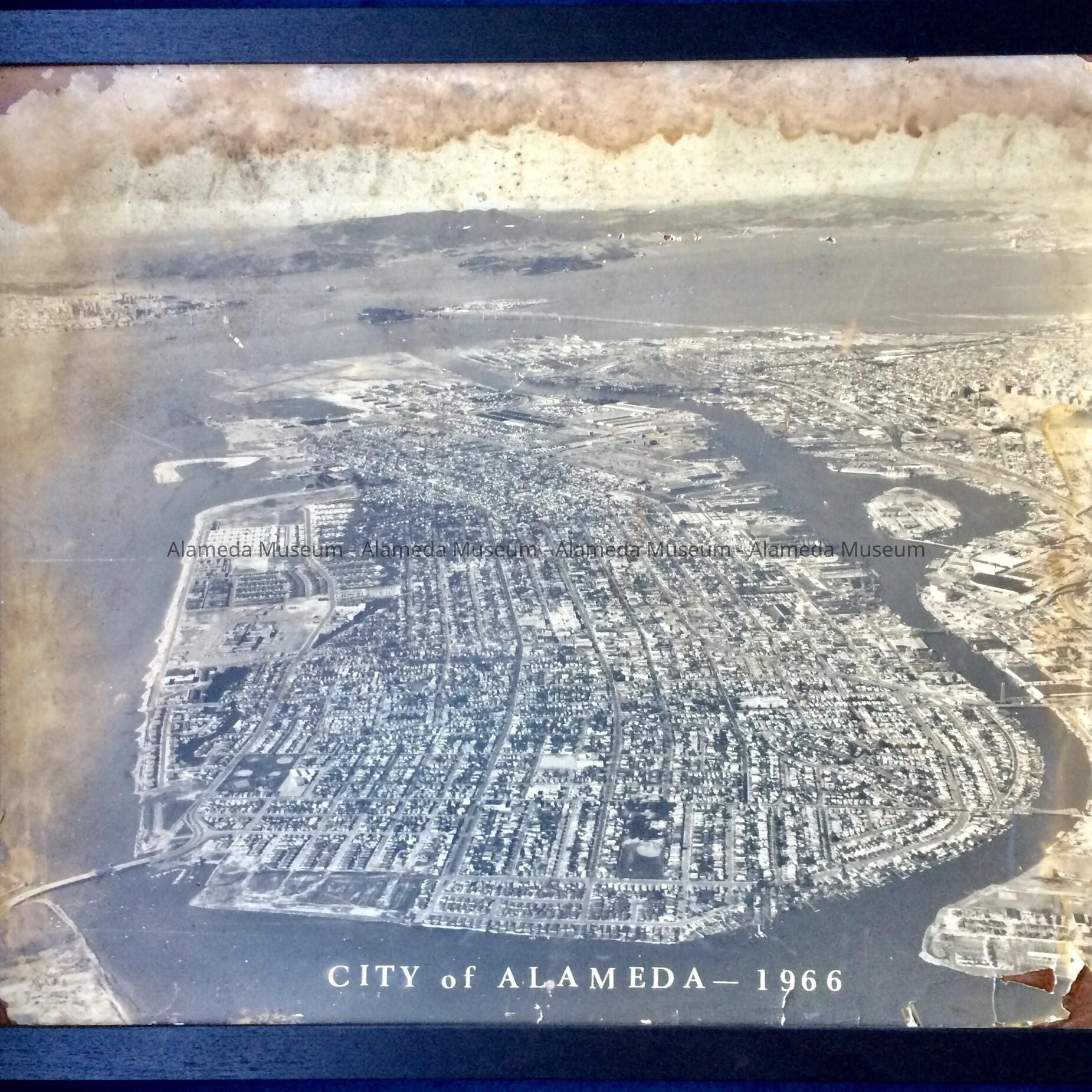 AN ENLARGED BLACK-AND-WHITE PHOTOGRAPH ATTACHED TO A PARTICLE BOARD. THE PHOTOGRAPH HAS A BOLD-PRINTED CAPTION, "CITY OF ALAMEDA - 1966," AND IS SIGNED IN THE LEFT CORNER, "MAPS, FREMONT, CALIF."