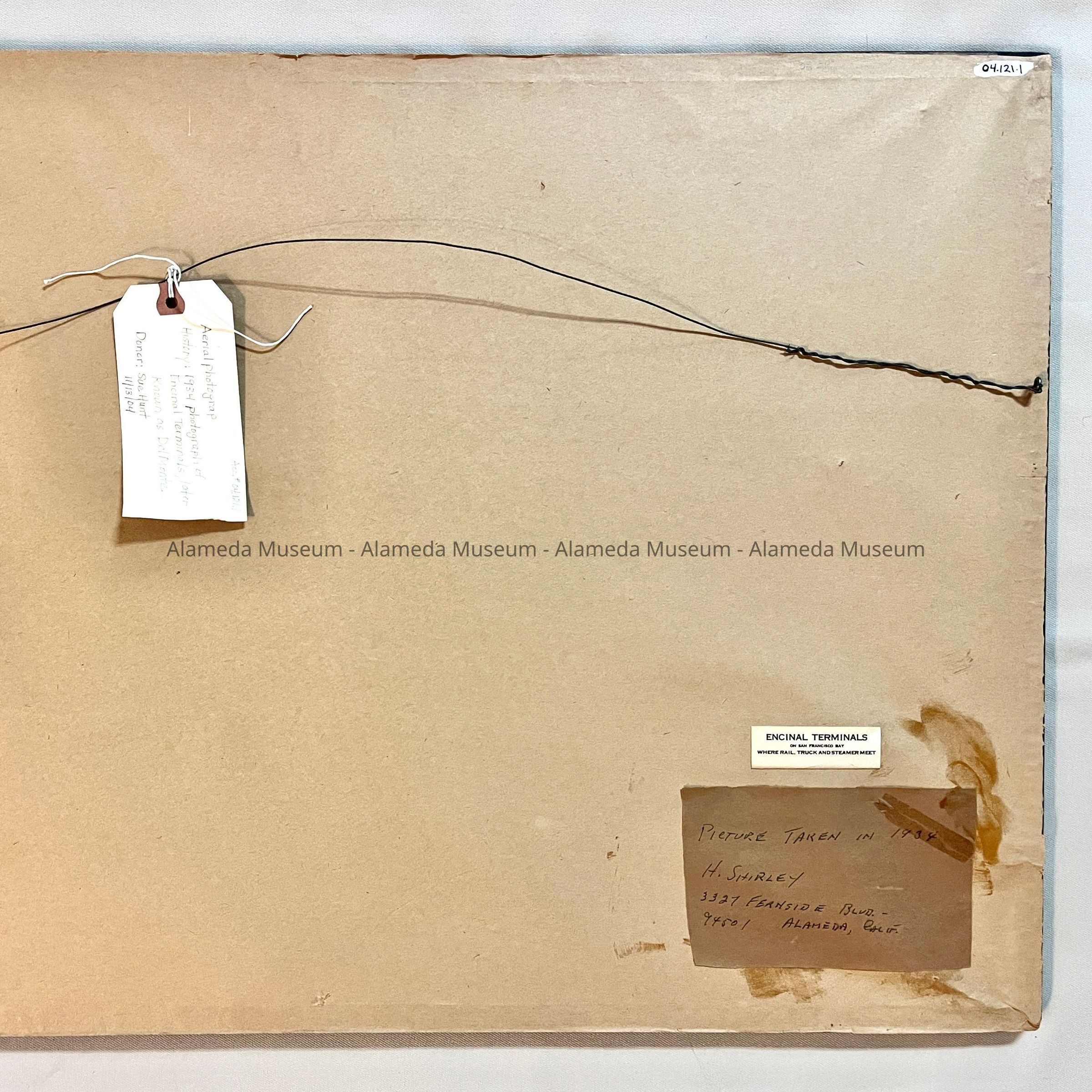HISTORY OF OBJECT: AN AERIAL PHOTOGRAPH OF ENCINAL TERMINALS IN THE VICINITY OF SHERMAN STREET AND BUENA VISTA AVENUE, ALAMEDA. THE WAREHOUSE, NOW KNOWN AS DEL MONTE THAT FACES BUENA VISTA AVENUE, IS PROMINENT IN THE PHOTOGRAPH.