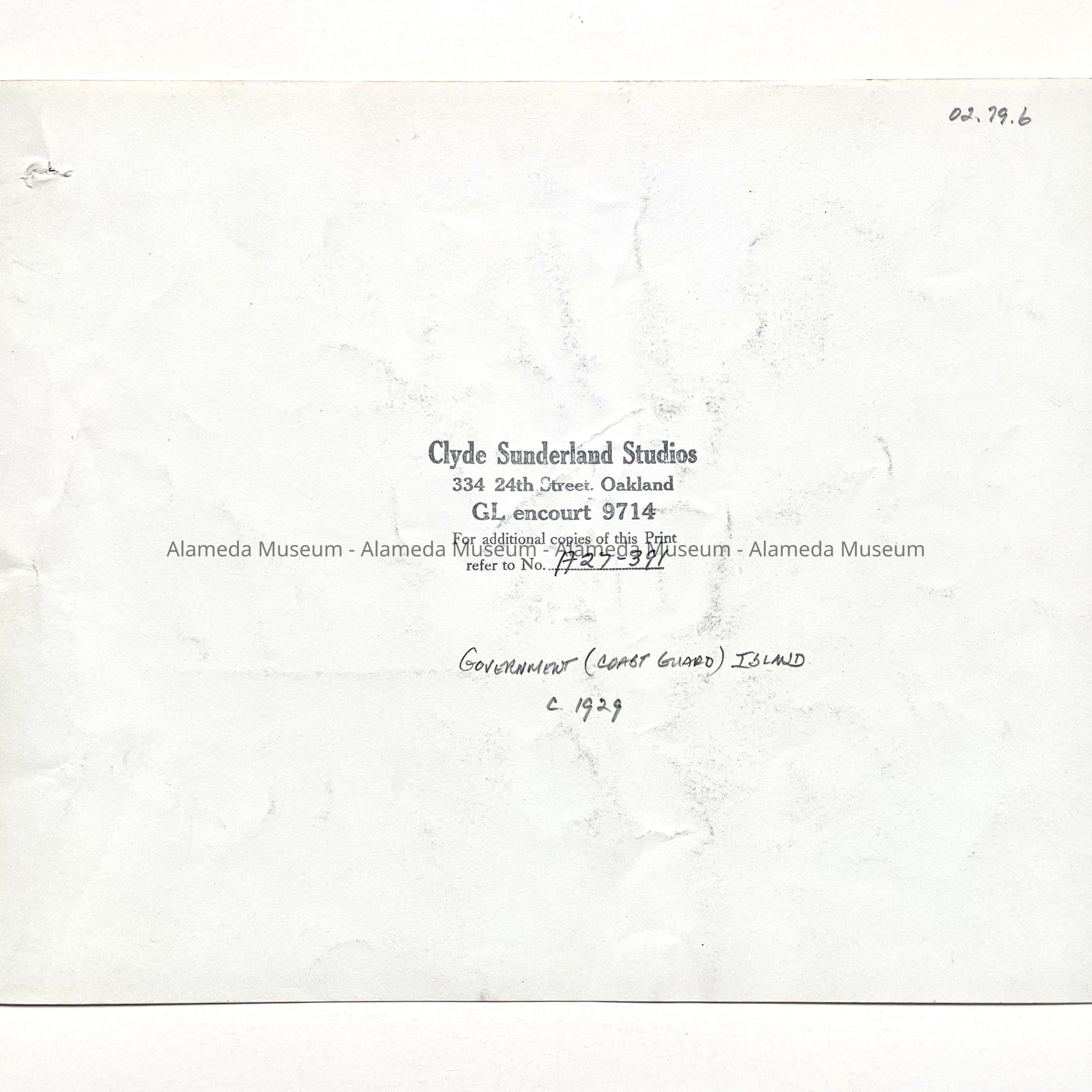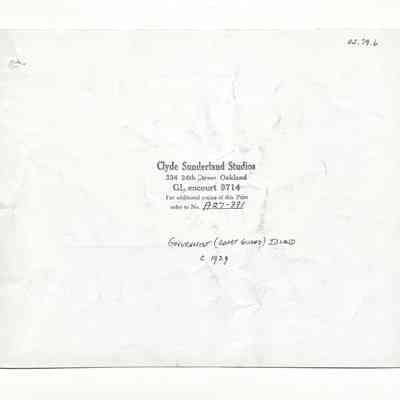 Description: Glossy black/white photo, unmounted. Photographer: Clyde Sutherland Studios, Oakland (per stamping on verso). Small puncture hole exists near the upper right corner.
