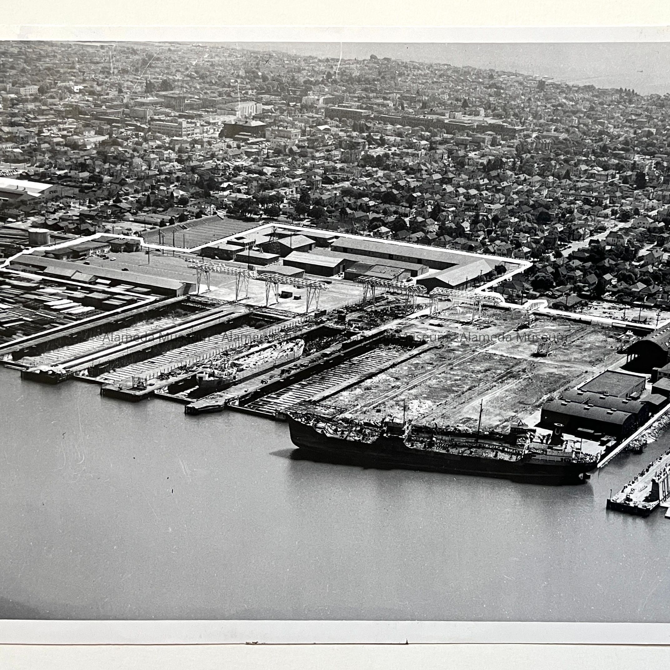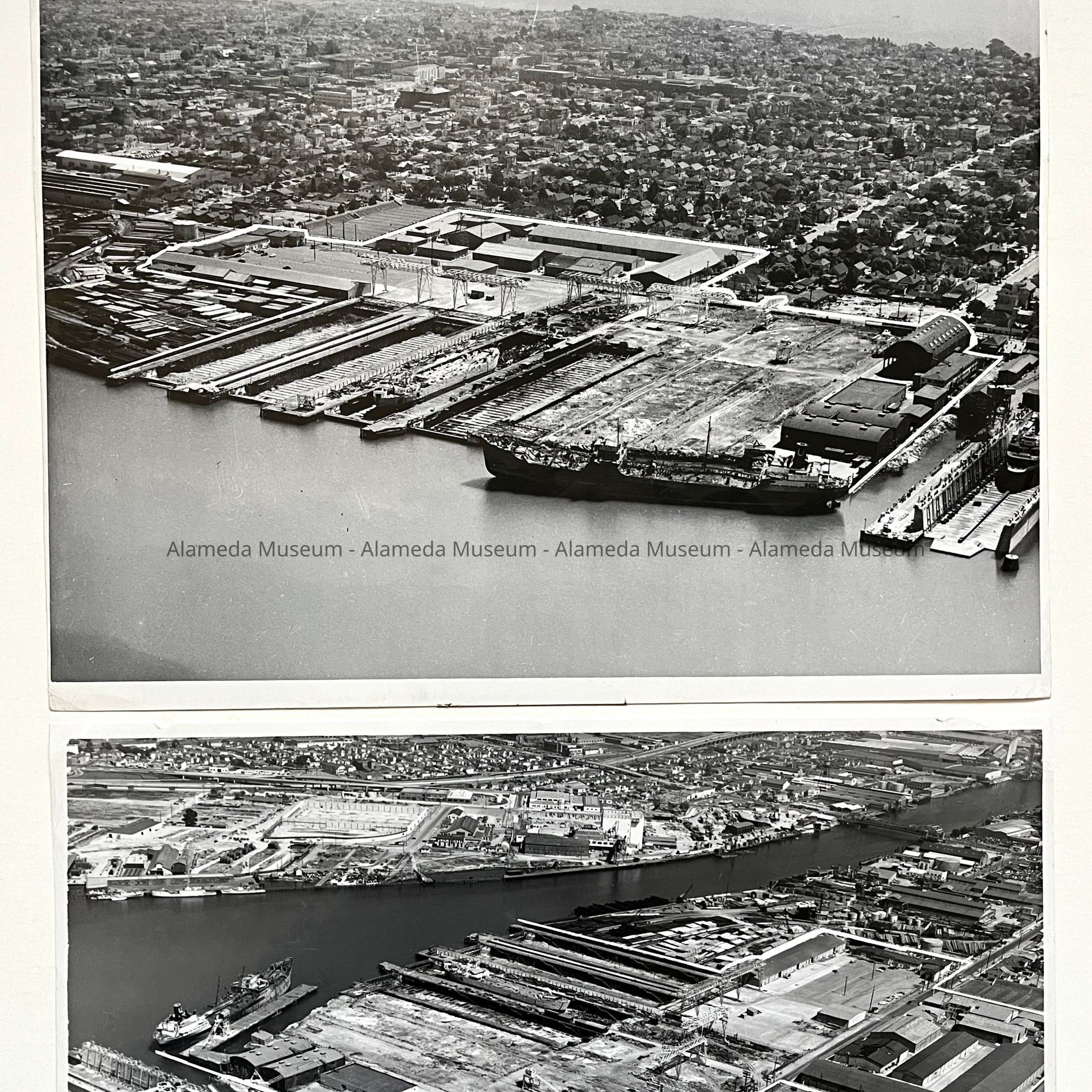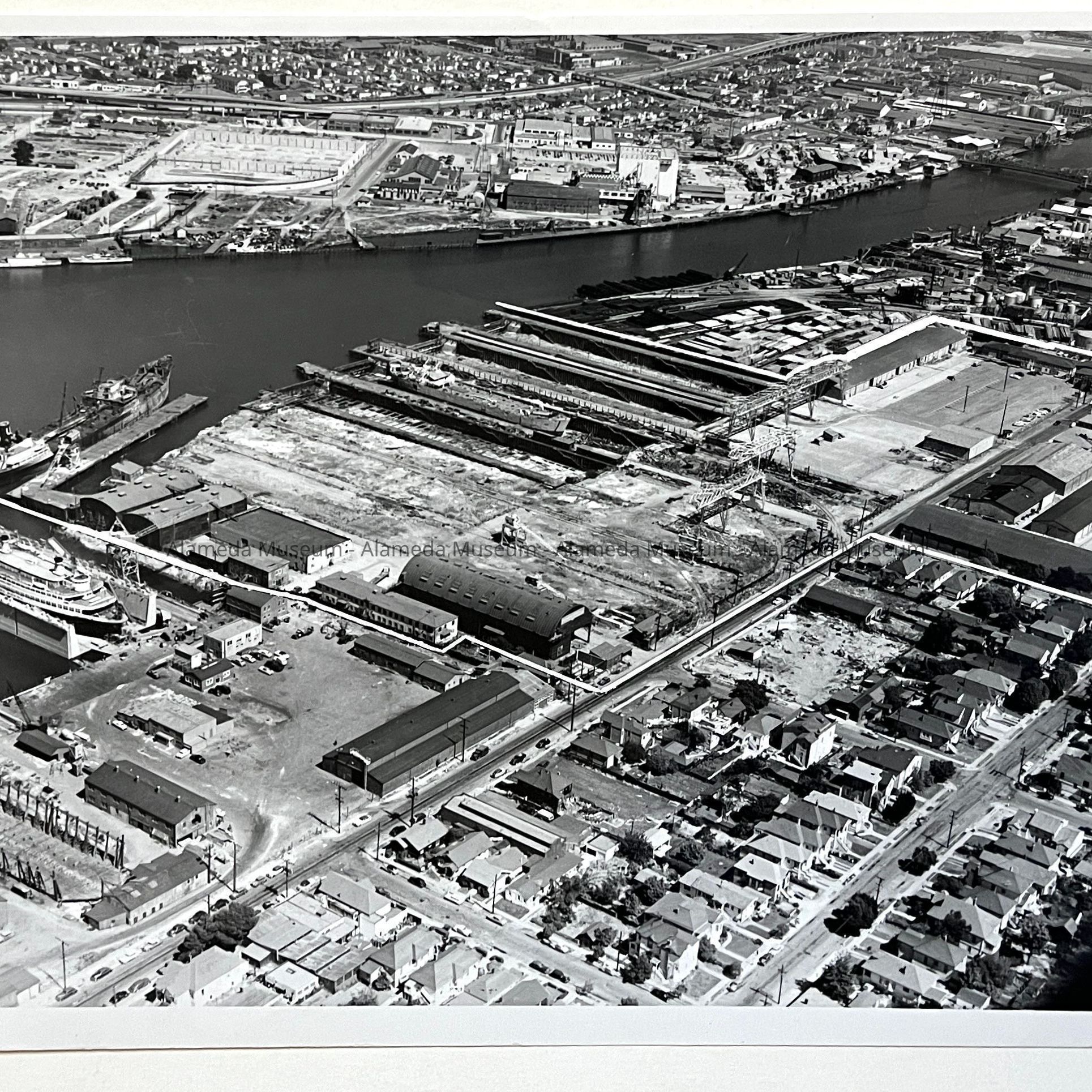 History of Object: Two aerial views of the Navy Graving Docks, Alameda (located from Chestnut to Walnut Streets, along the Estuary). The boundary of this property has been outlined in the negatives: a) Southwest view, showing the Bay; b) Southeast view, with Oakland in the background.