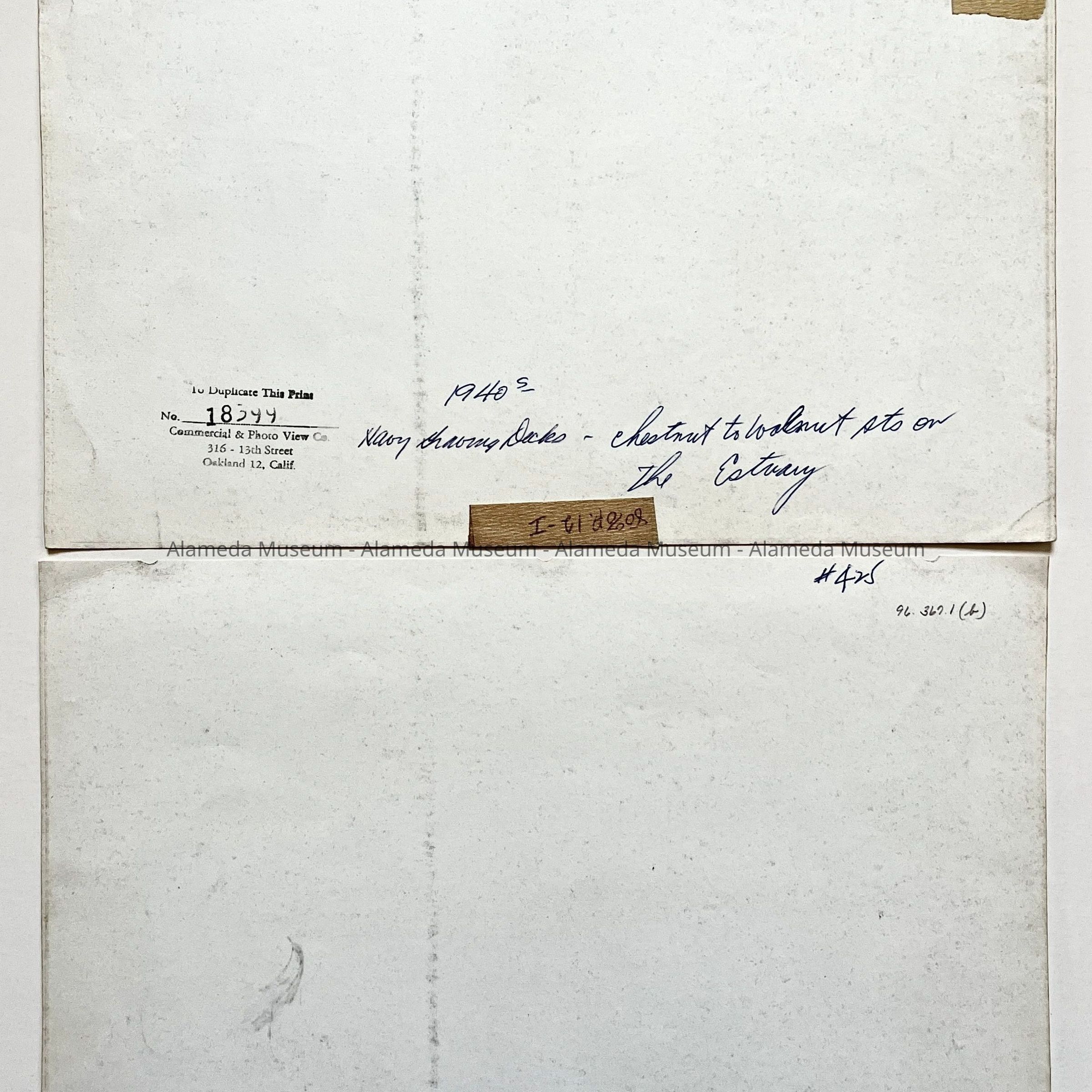 Description: Two glossy black/white photos, unmounted. Photographer: Commercial & Photo View Co., 316 15th St., Oakland. Upper margins have three binder ring holes and an old cataloging number written in blue ballpoint ink.