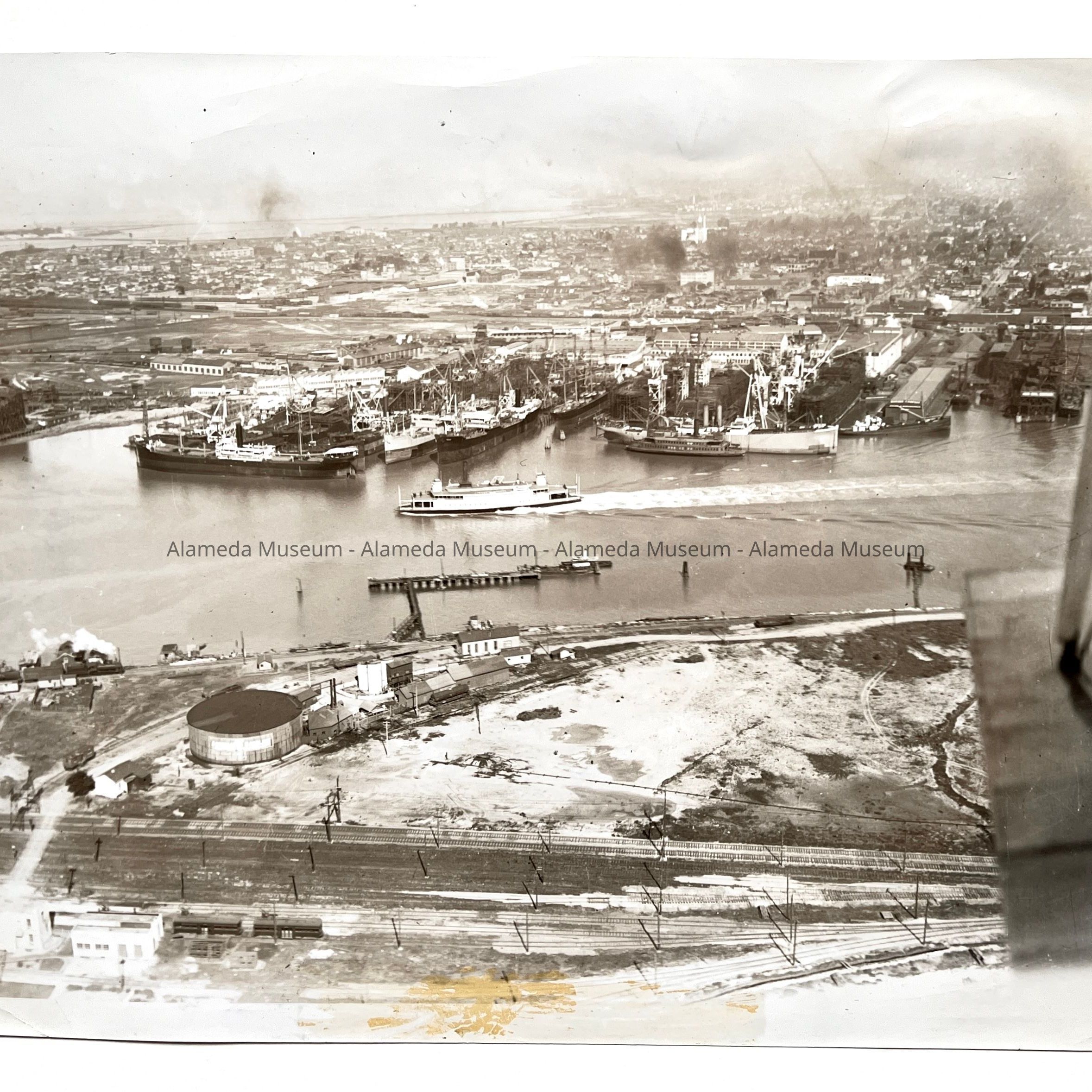 History of Object: Aerial view of the Oakland Estuary showing the auto ferry (name of vessel unknown) sailing enroute to San Francisco. Good view of the Oakland/Alameda port facilities.