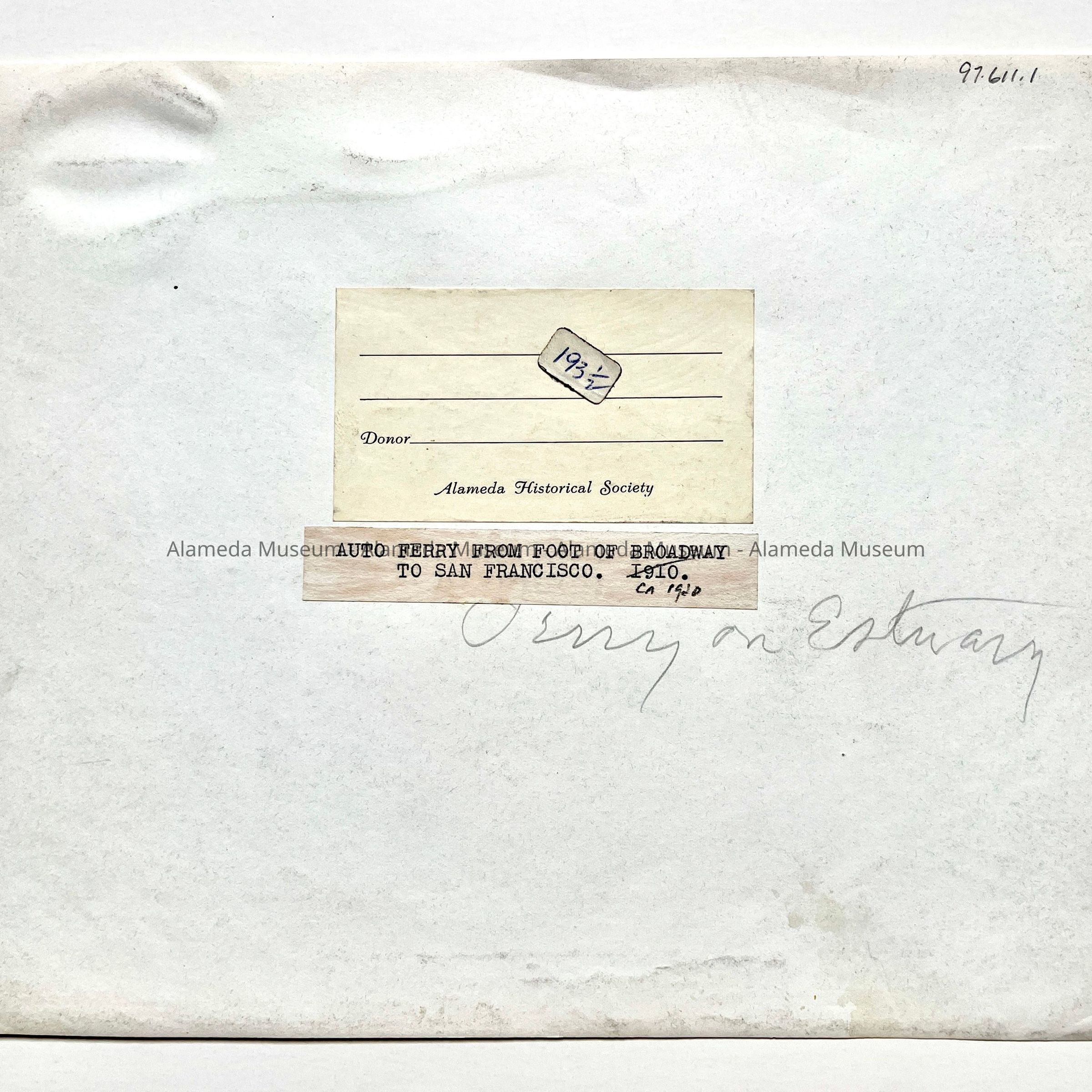 Aerial photo of the Alameda-Oakland Estuary with auto ferry, c. 1920Entry/Object ID