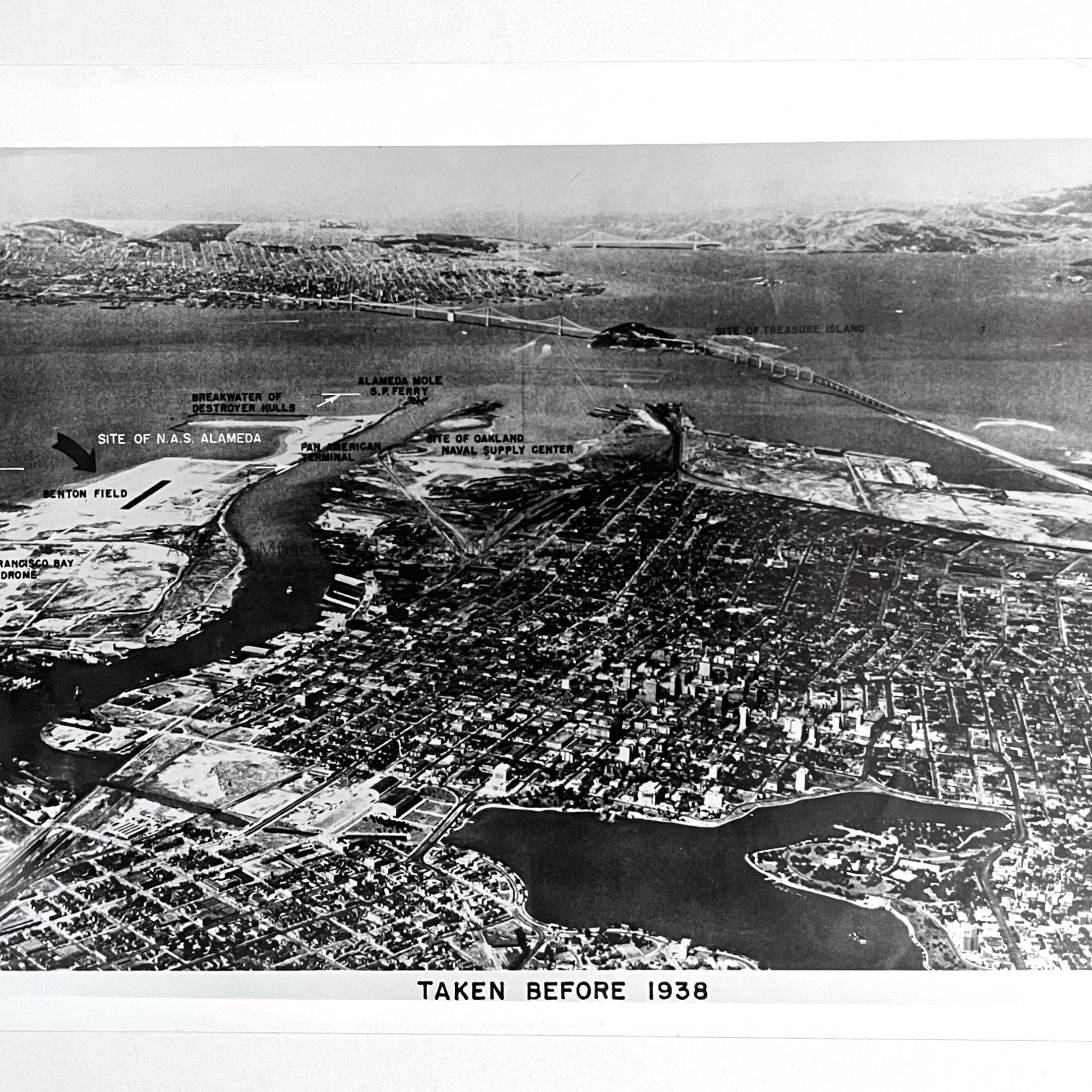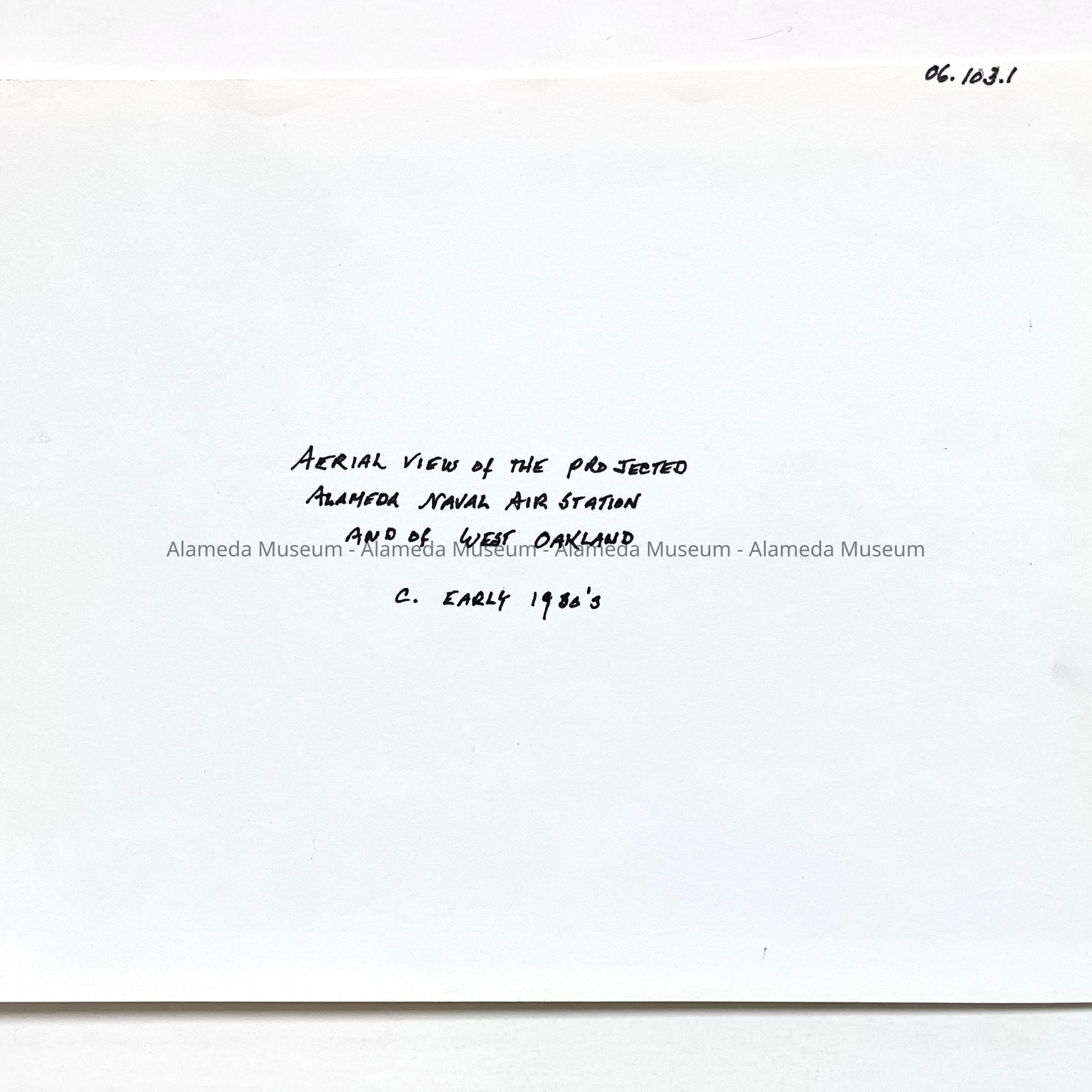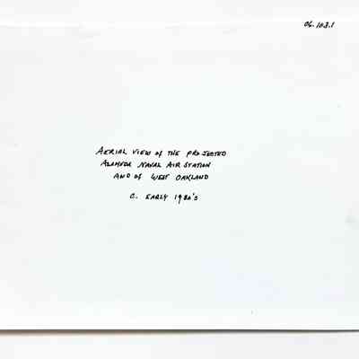 History of Object: Aerial view of the site of the projected Alameda Naval Air Station, and of West Oakland, showing the estuary and Lake Merritt.