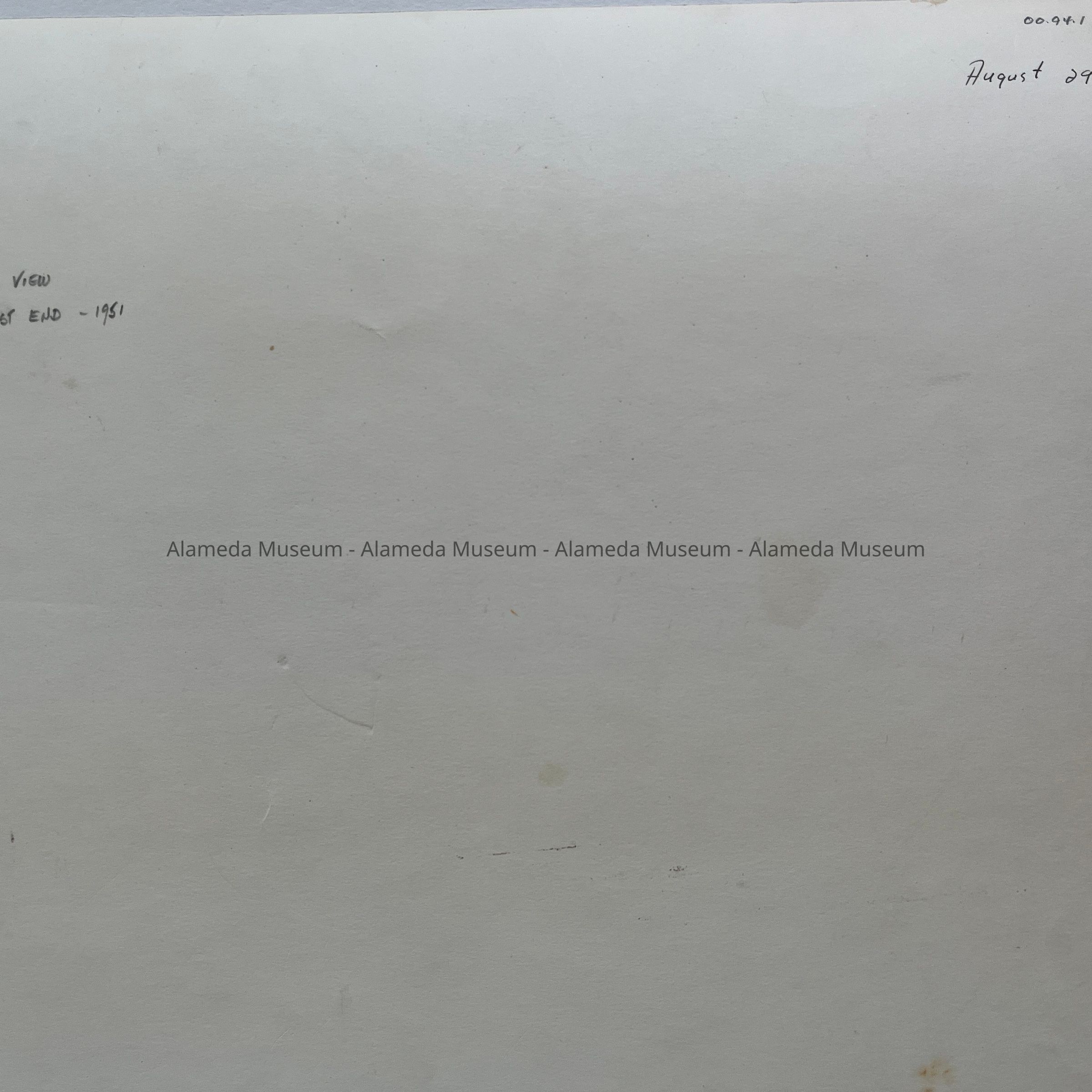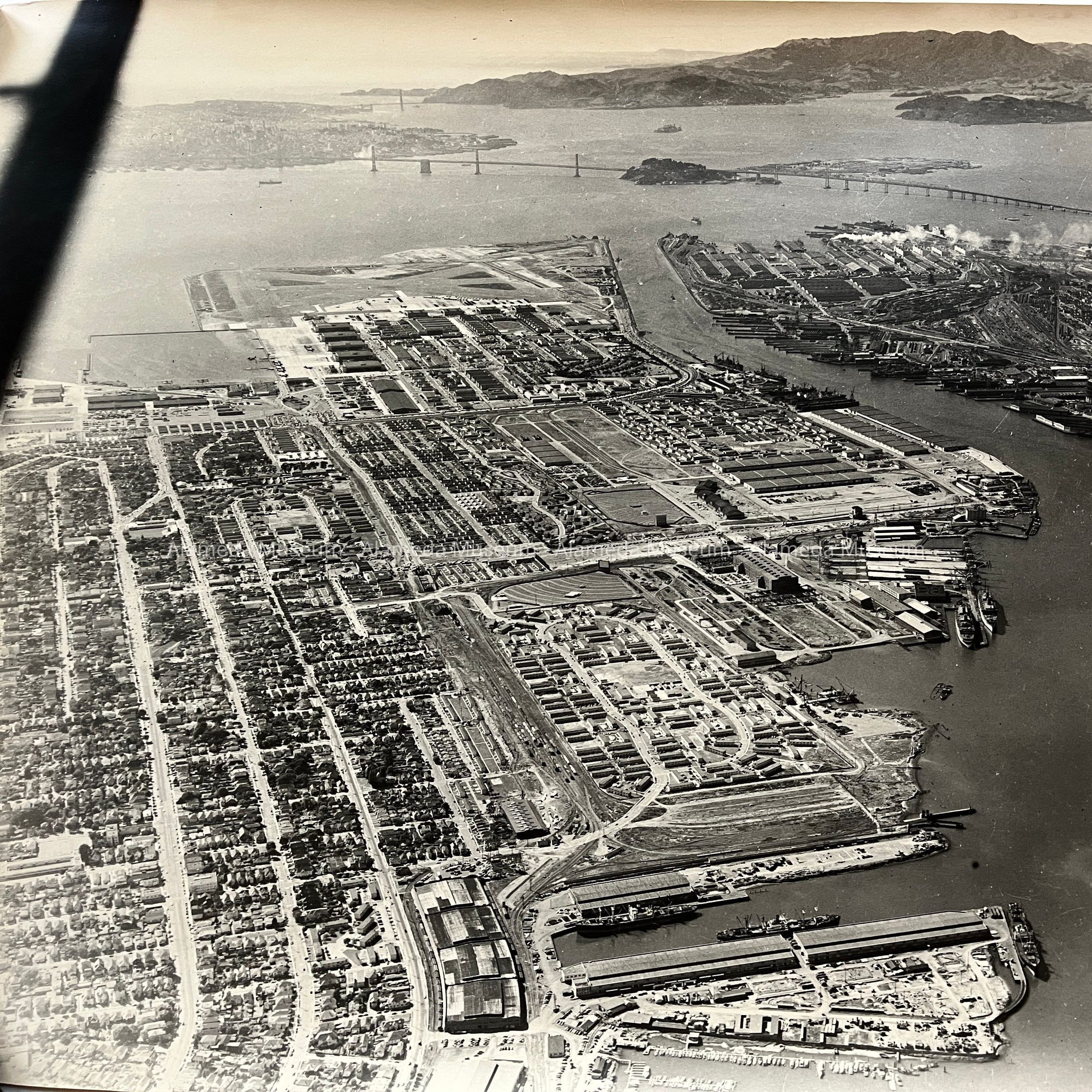 History of Object: Aerial view of the West End of Alameda showing residential districts, the Naval Air Station, the Oakland Army Base; in the distance, the Bay Bridge, San Francisco, and Marin County. The image is dated Aug. 19, 1951 on its verso in blue ink.