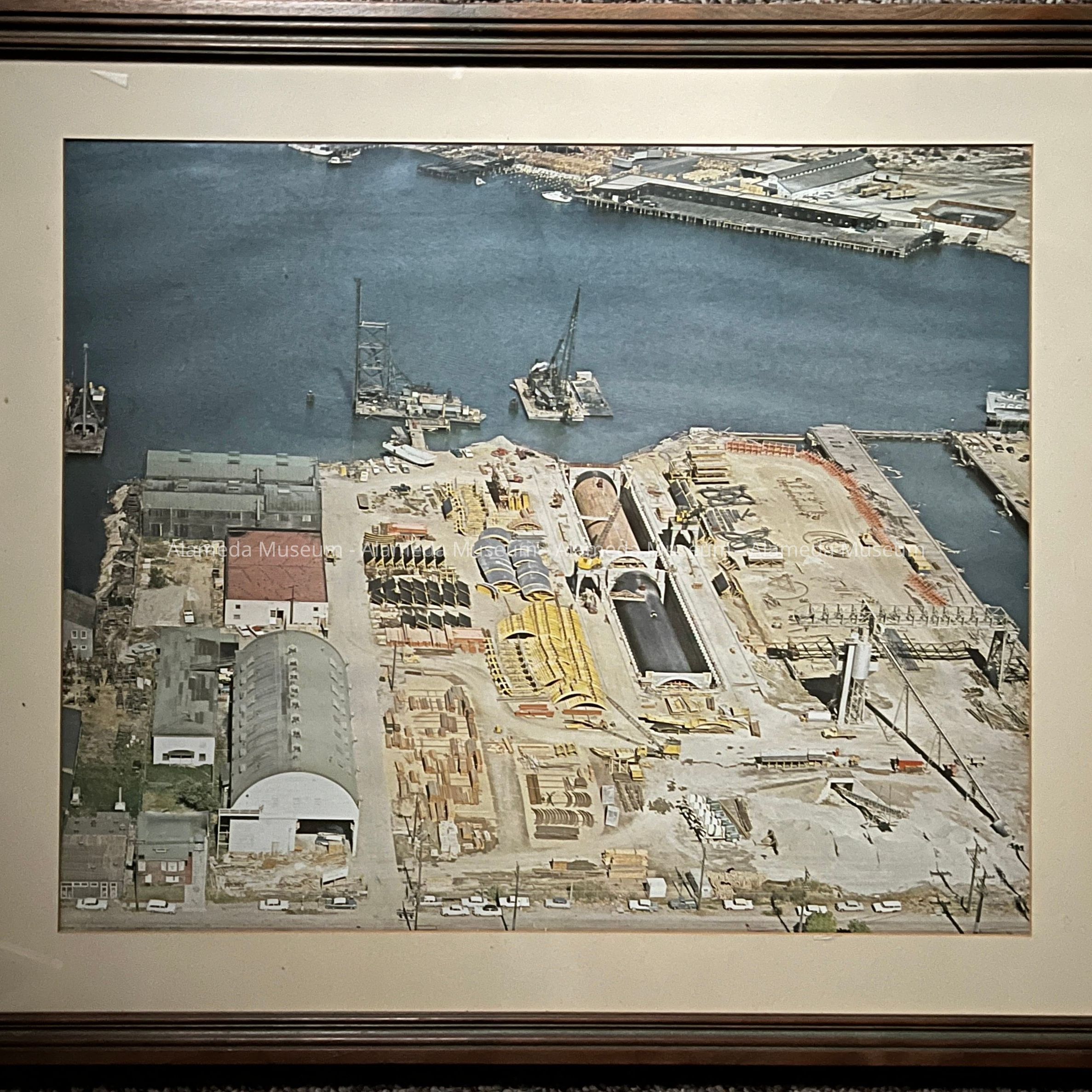 Description: Aerial color photograph, of a construction yard with water on 3 sides, with large tube sections, and at left, buildings of different shapes and sizes. Photograph is housed in dark red varnished wood frame behind glass and mat, and backed with tan backing paper.