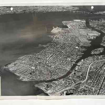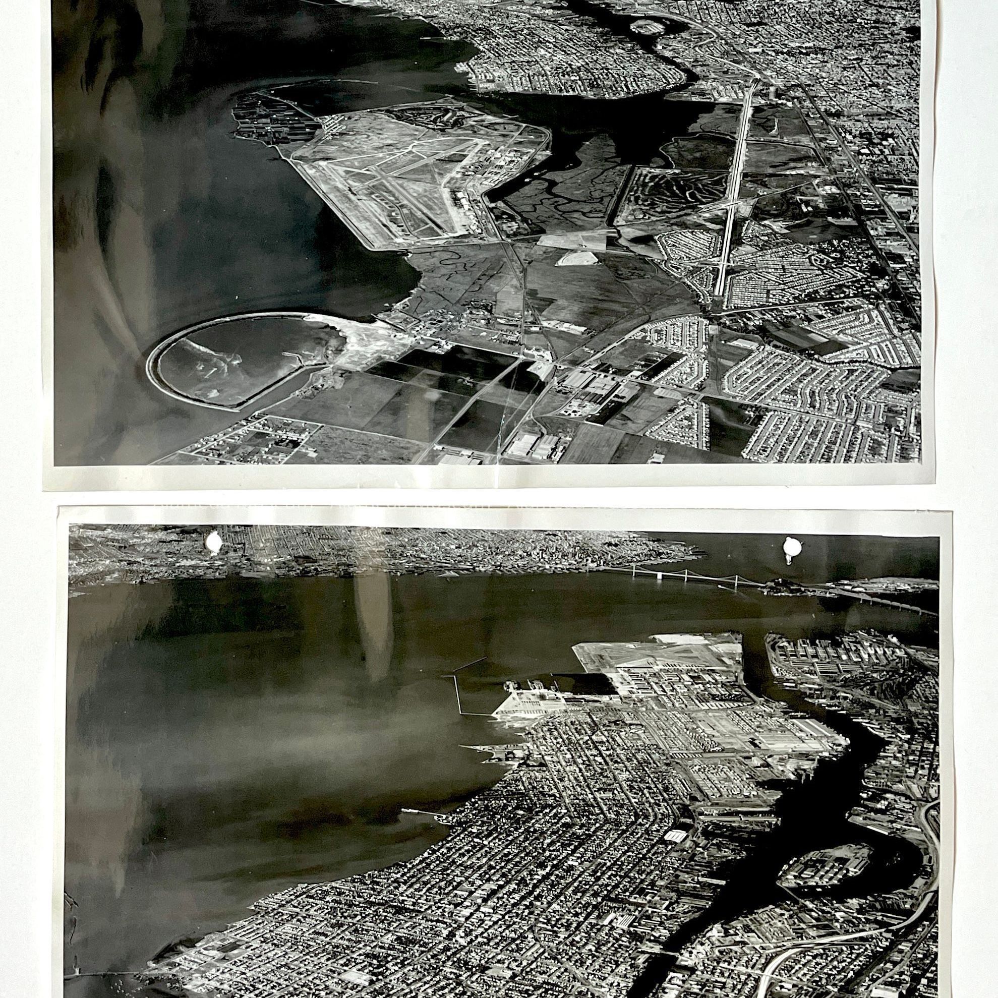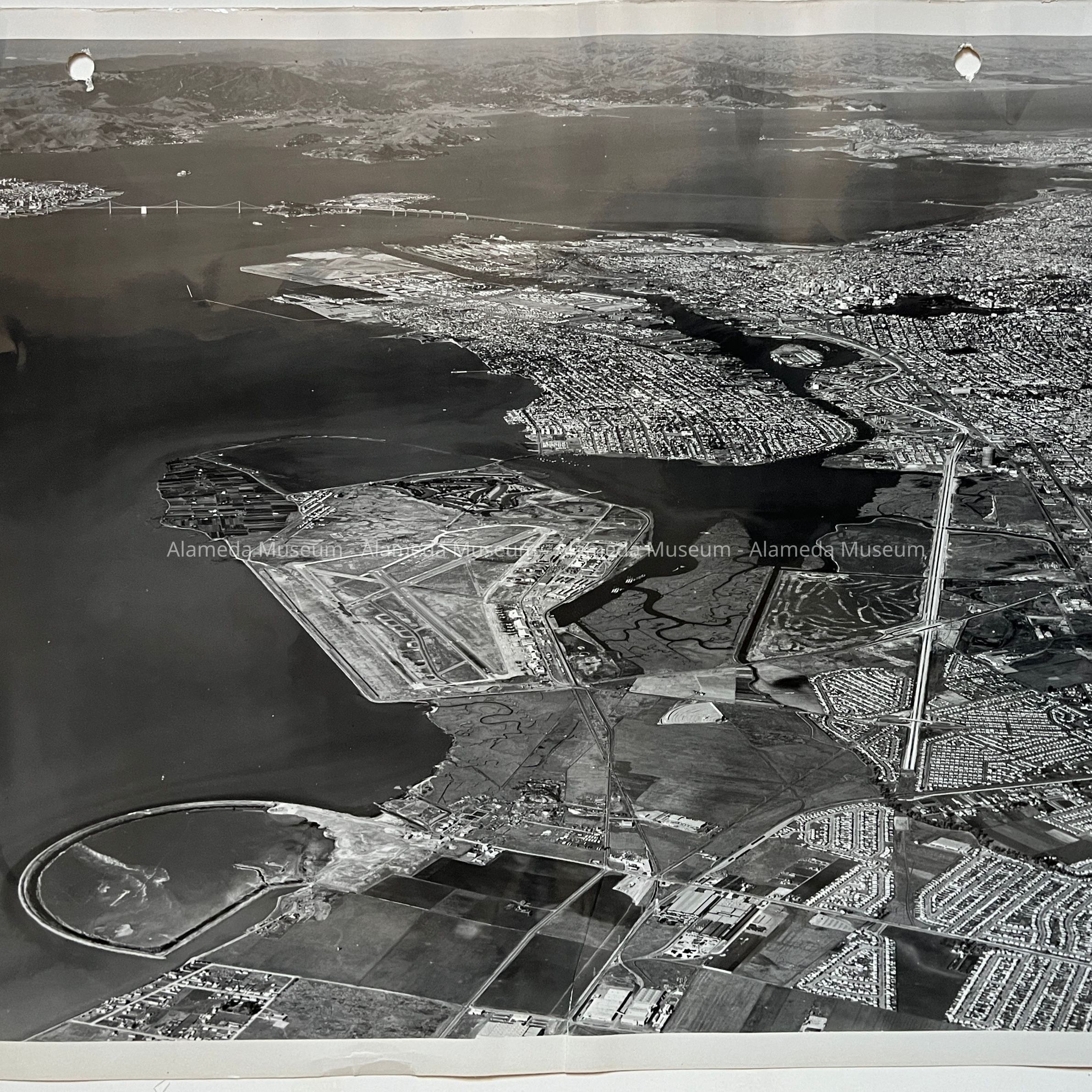 TWO PHOTOGRAPHS DEPICTING AERIAL VIEWS OF ALAMEDA AND BAY FARM ISLAND. BOTH PHOTOGRAPHS ARE PIERCED AND APPEAR TO HAVE BEEN PART OF ILLUSTRATIONS IN A BINDER.