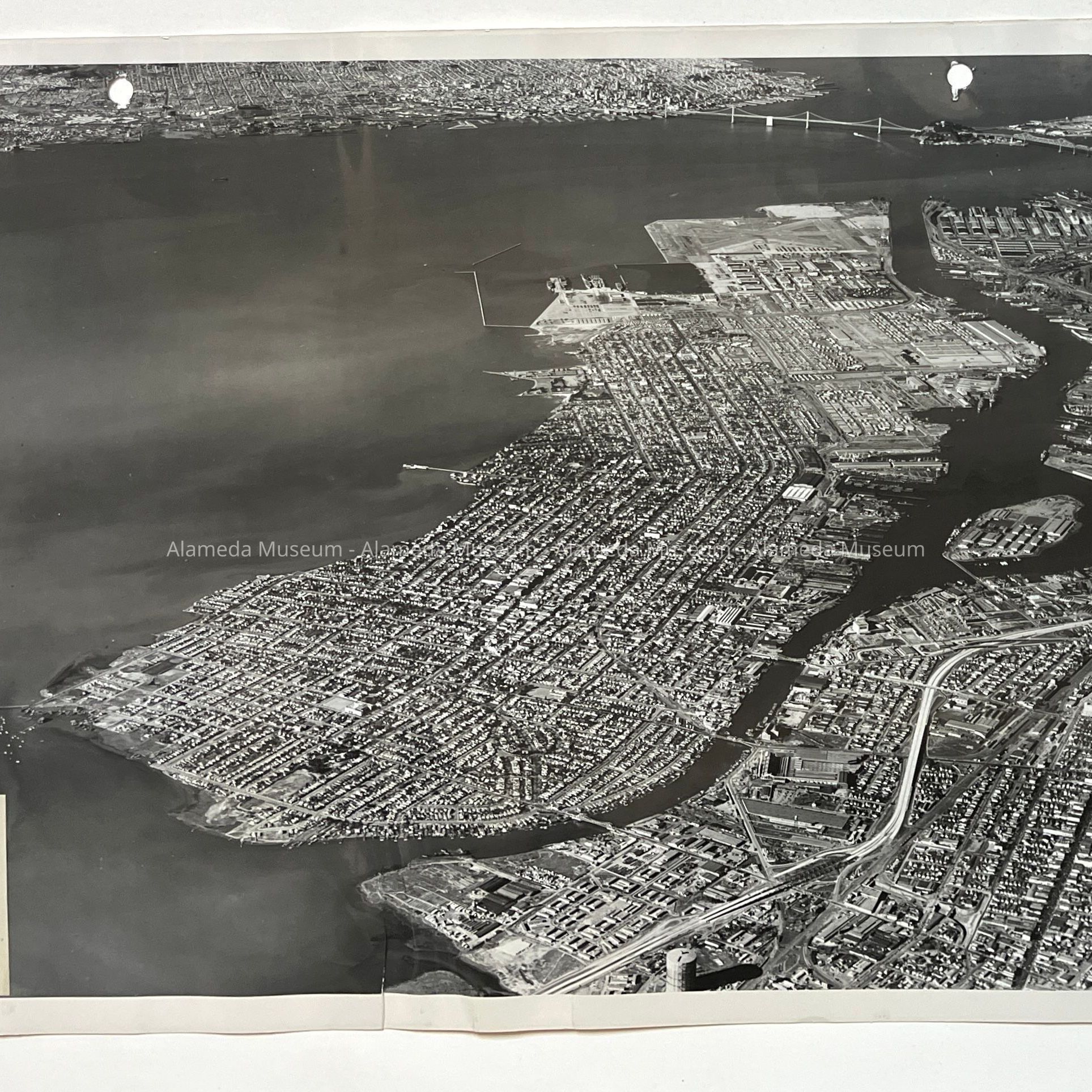 B. DEPICTS THE ENTIRE ISLAND OF ALAMEDA. THE BAY FARM ISLAND BRIDGE CAN BEEN SEEN IN THE DISTANCE.