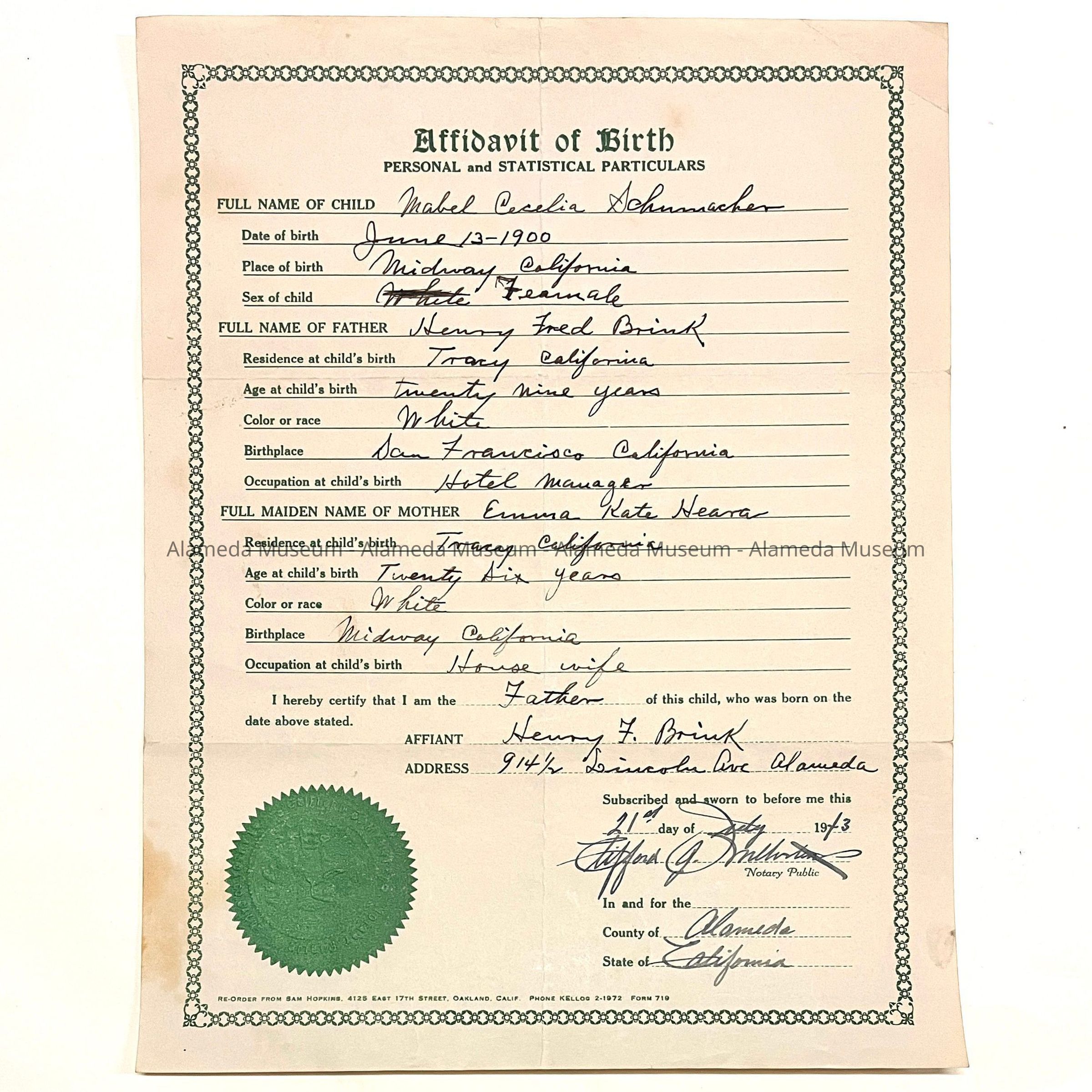 Affidavit of birth for Mabel Cecelia Brink Schumacher. born June 13, 1900. Mabel was the daughter of Henry F. & Emma Kato Brink, old-time residents of Alameda. Mr. Brink was said to have been a proprietor of a saloon on Park Street, near the Lincoln Avenue railroad depot.