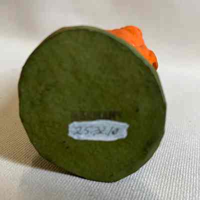 Description: Statuette of gypsum of a standing man, bent forward, left foot forward, left hand on hip, holding a box with domed top. The figure is hand-painted and glazed, with black skin, wearing a sky-blue robe, orange cloak, purple turban with gold top, and red shoes. Hem, sleeves, neckline and belt and cap are decorated in gold-paint. The jar is painted silver, and the base is painted moss-green. Underside is stamped: 'GERMANY' in black.