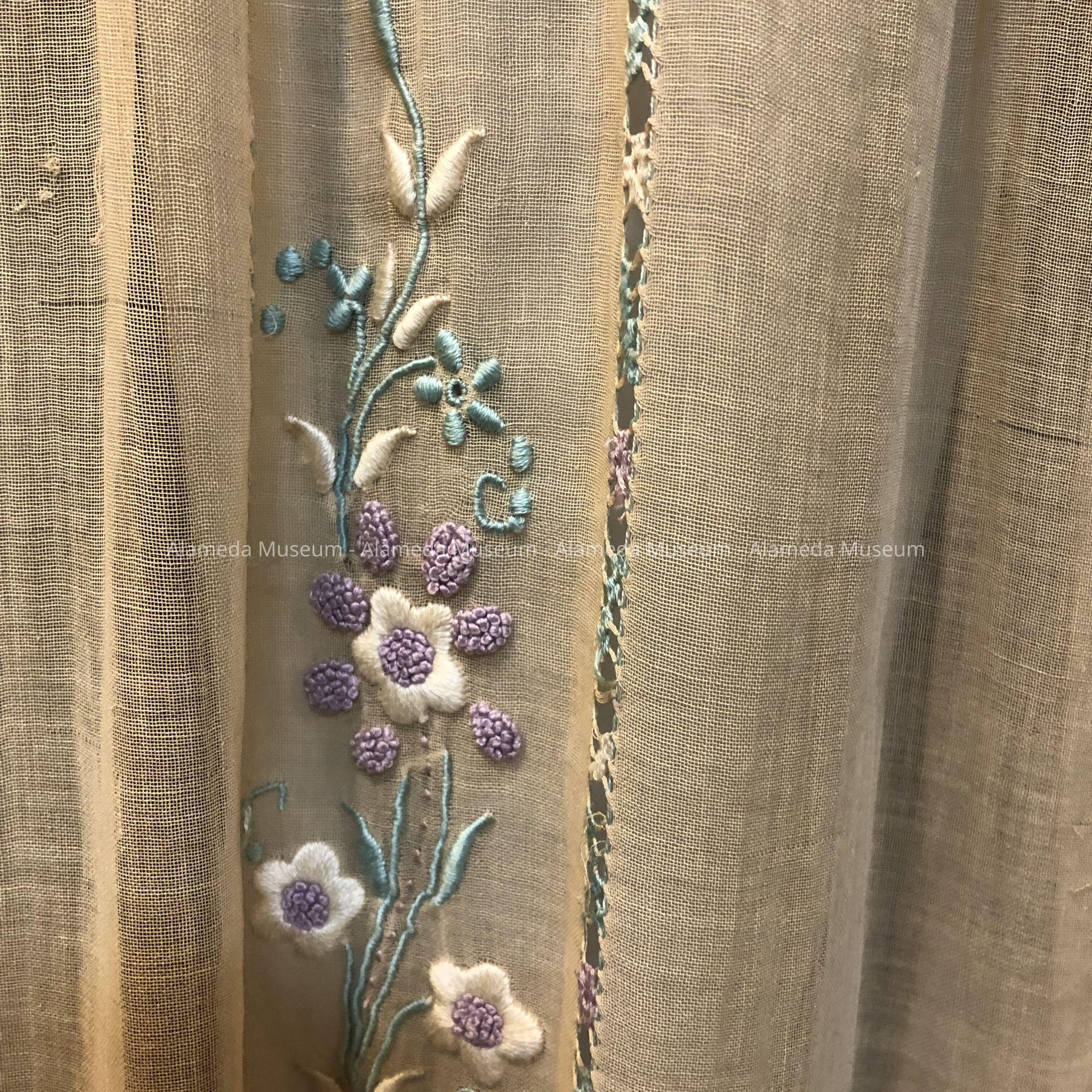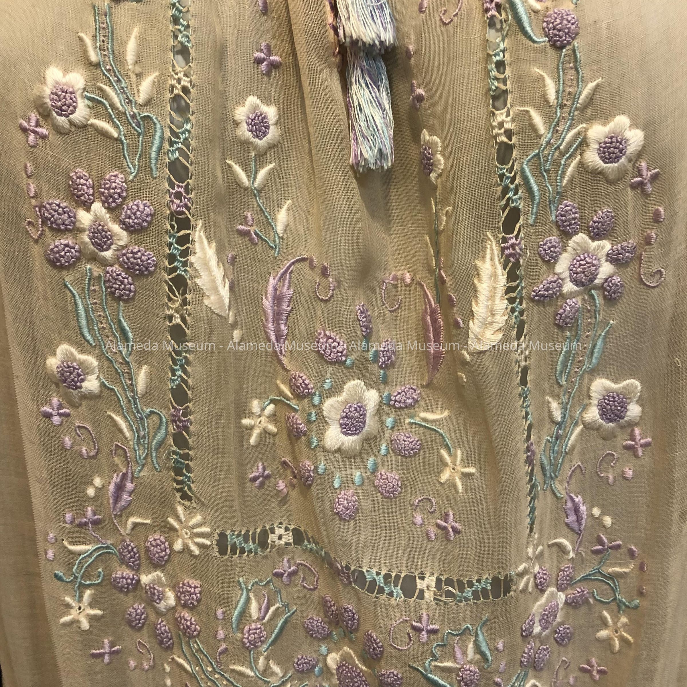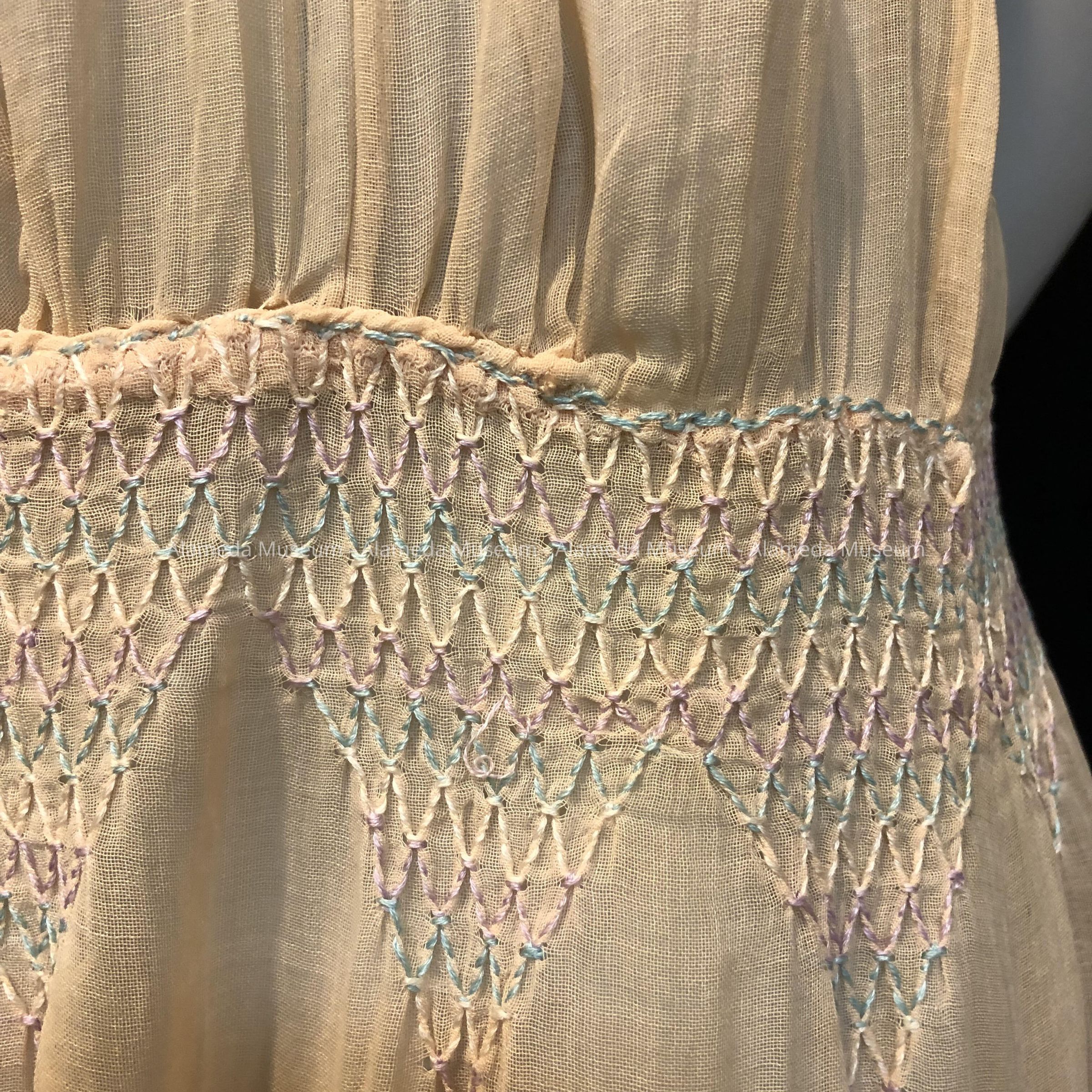 Afternoon dress of peach colored voile (one piece) with bodice embroidered with lavender, turquoise & white flowers. Embroidered stitching at neck & waistline.