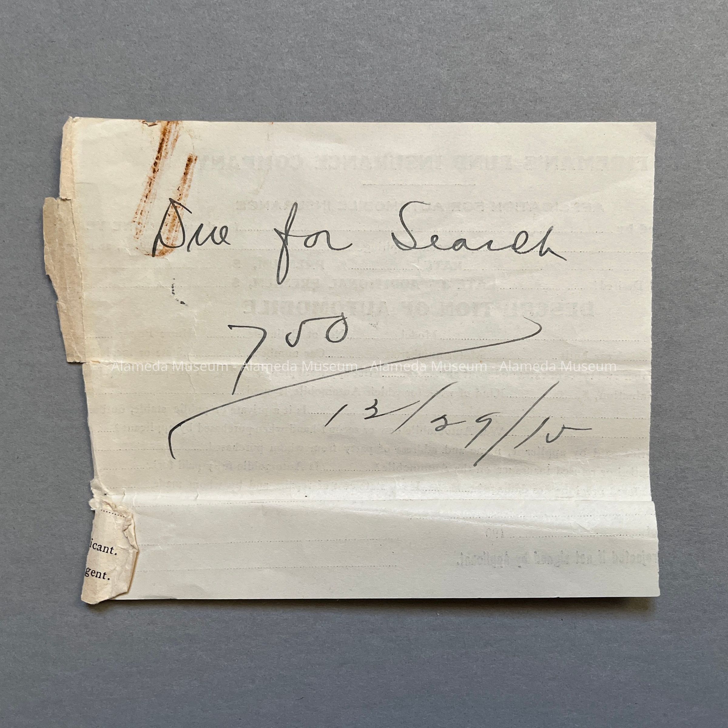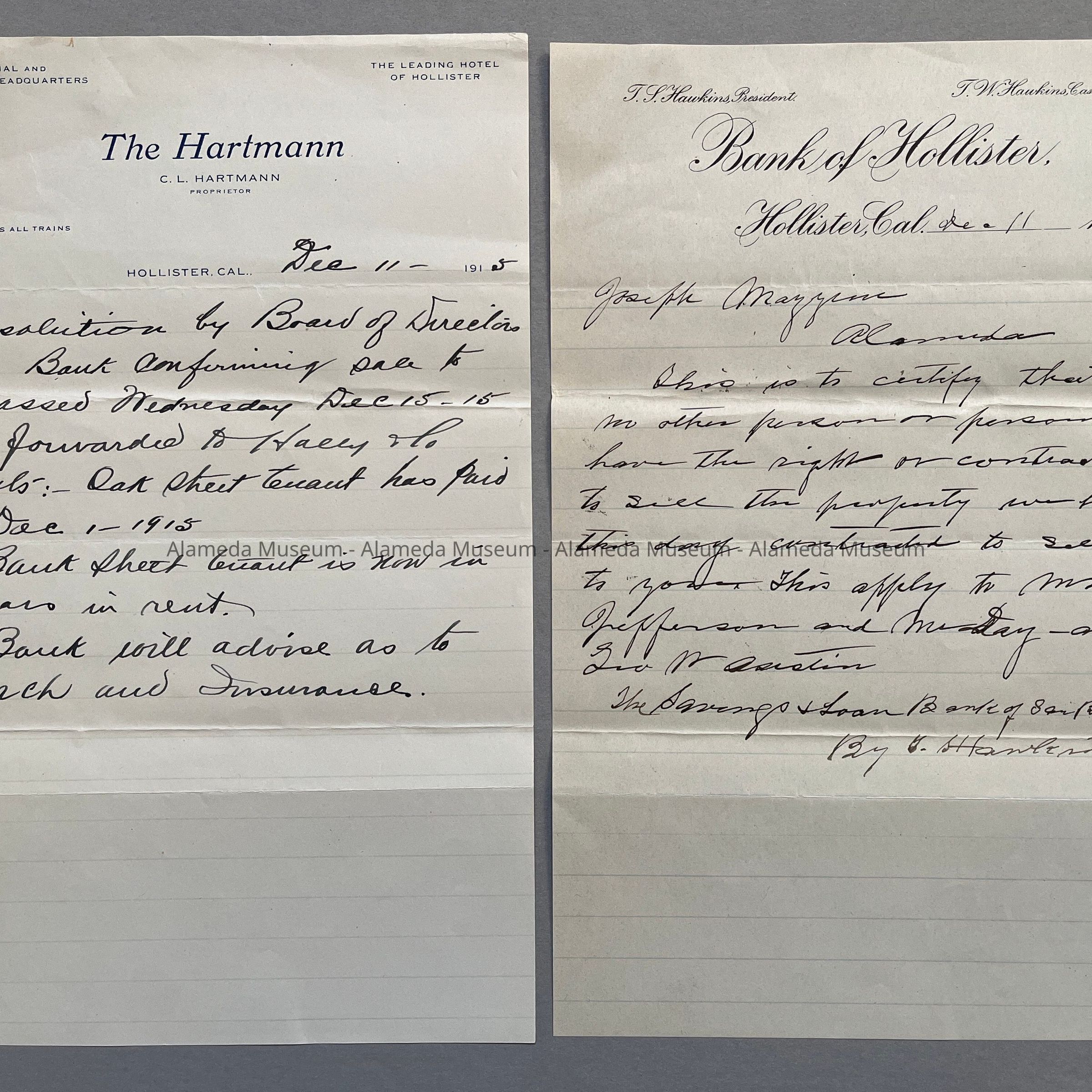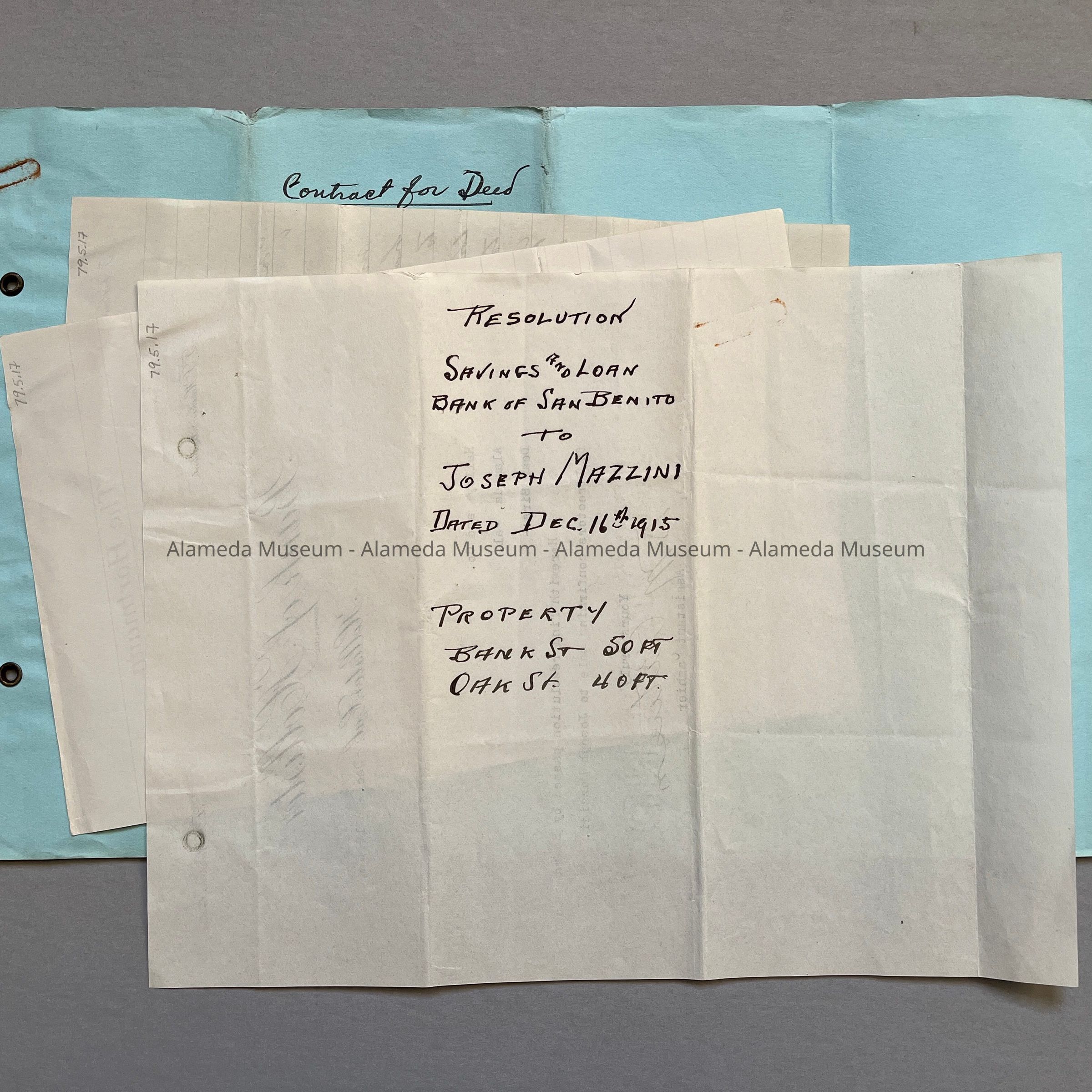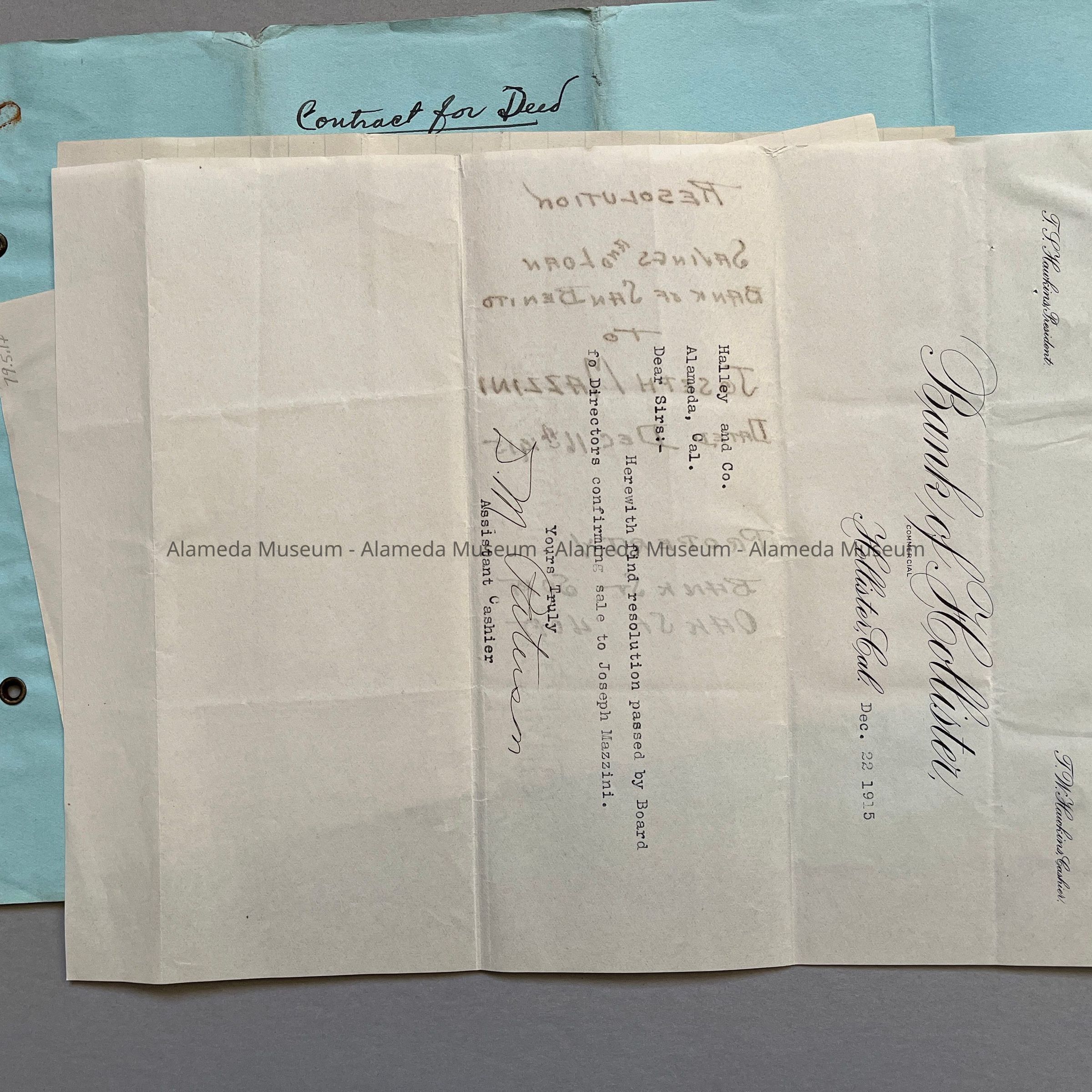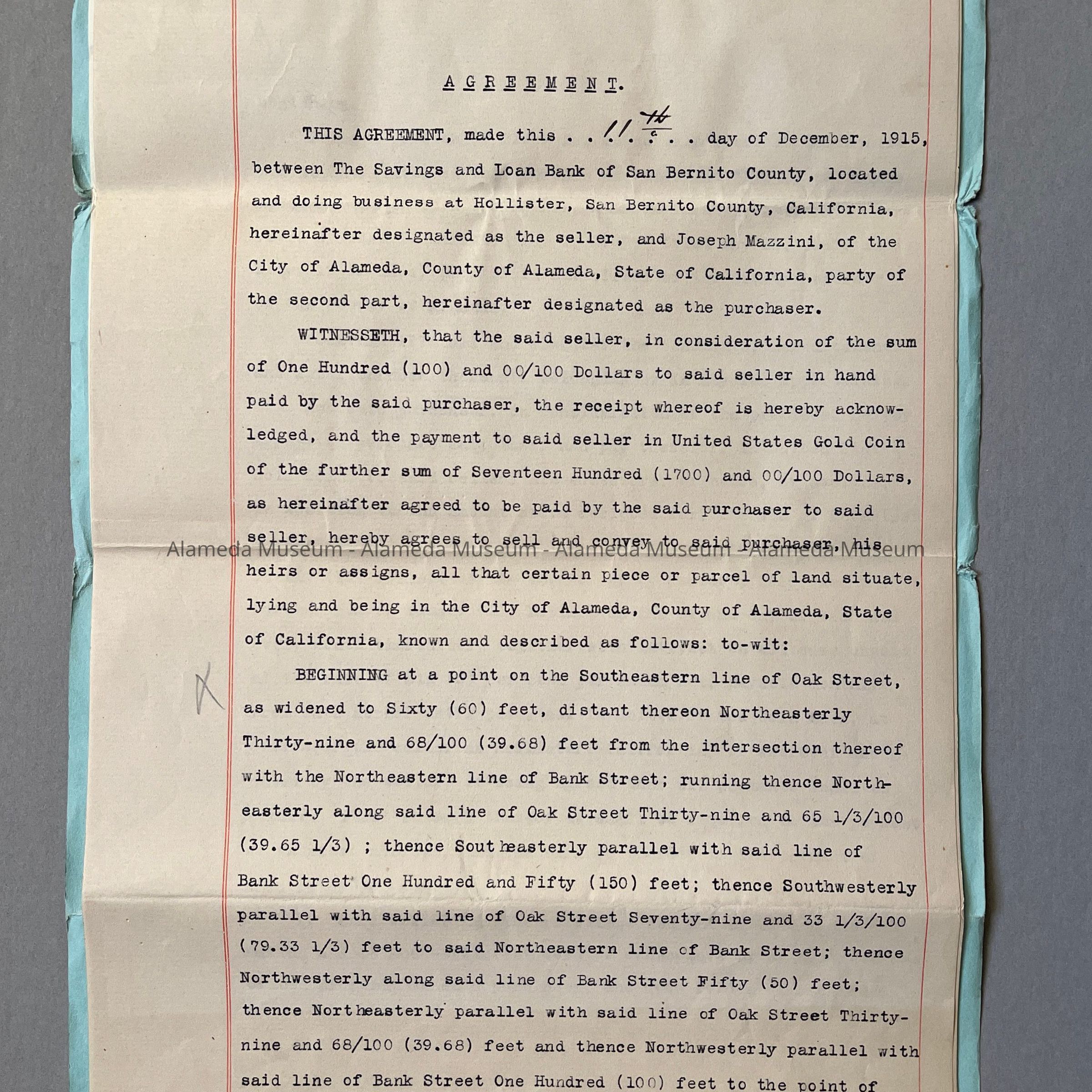 HISTORY OF OBJECT: AGREEMENT OF SALE, DATED DEC 11, 1915, BETWEEN THE SAVINGS AND LOAN BANK OF SAN BERNITO COUNTY, HOLLISTER, CALIF, AND JOSEPH MAZZINI OF ALAMEDA, FOR PROPERTY IN ALAMEDA (LOCATED ON OAK STREET, NORTH OF SANTA CLARA AVENUE). ALSO ENCLOSED IS A LETTER OF CONFIRMATION OF SALE FROM THE BANK OF HOLLISTER, HOLLISTER, CALIF.