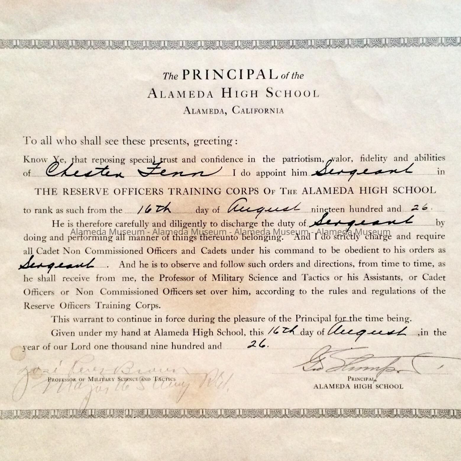 History of Object: Certificate appointing Chester Fenn, of 2038 Alameda Avenue, Sergeant in Alameda High School's ROTC program on August 16, 1926.