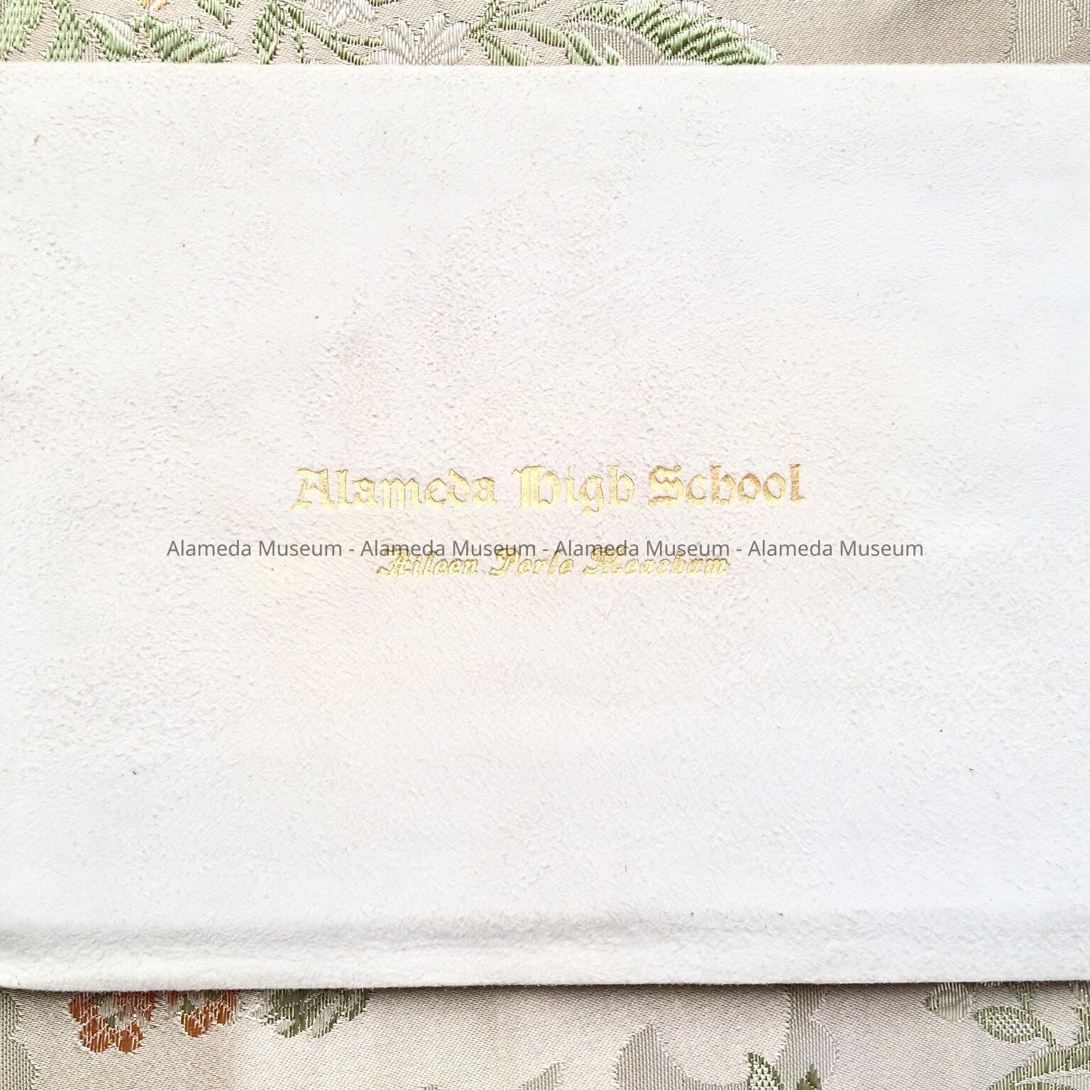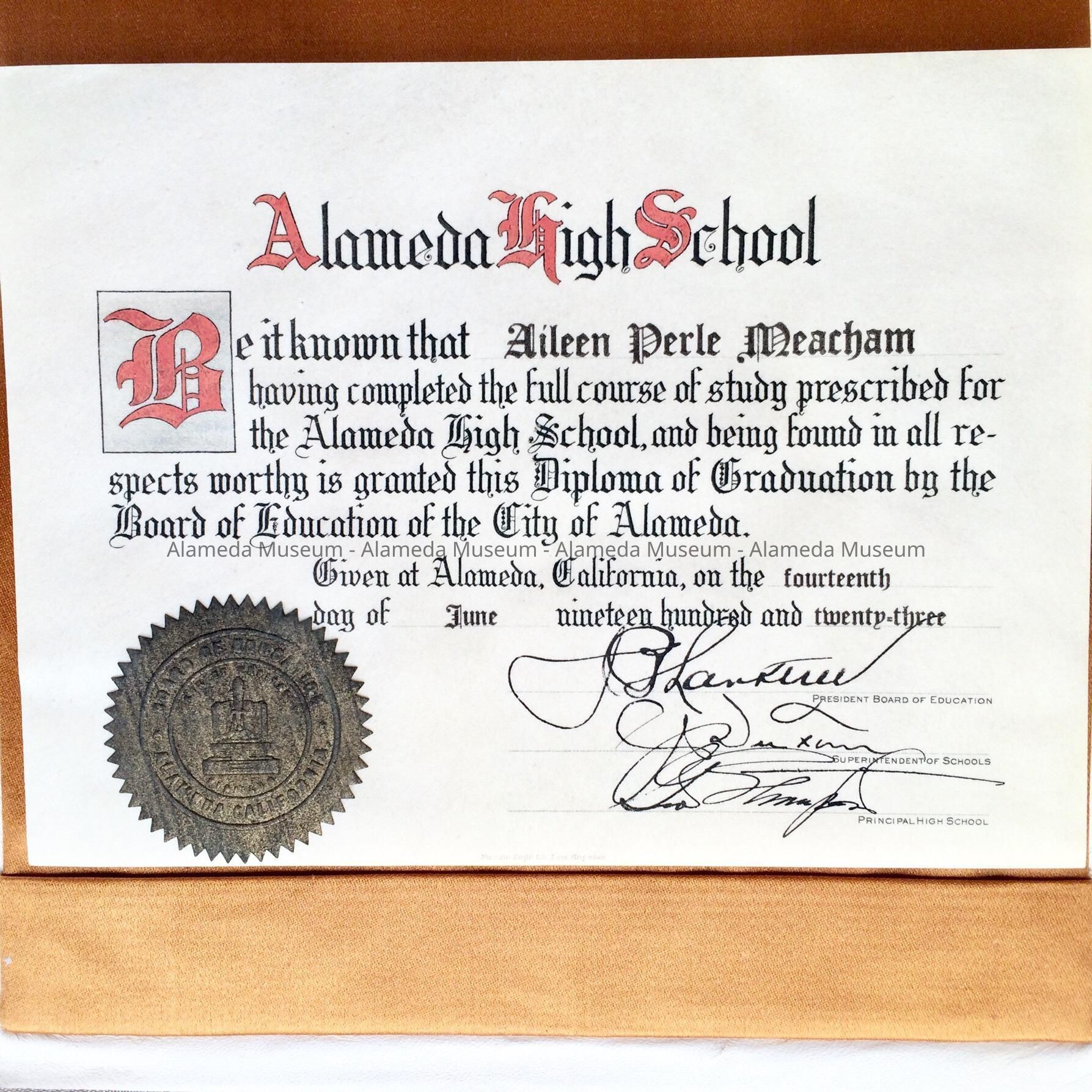 Description: Diploma with folding kidd cover (white), incised gold lettering "Alameda High School, Aileen Perle Meacham" on cover. Interior has gold silk lining with pocket containing parchment paper diploma with gold Board of Education Seal, Alameda. Signatures on the diploma: J. B. Lanktree, president Board of Education, Geo. Thompson, principal High School, dated June 14, 1923.