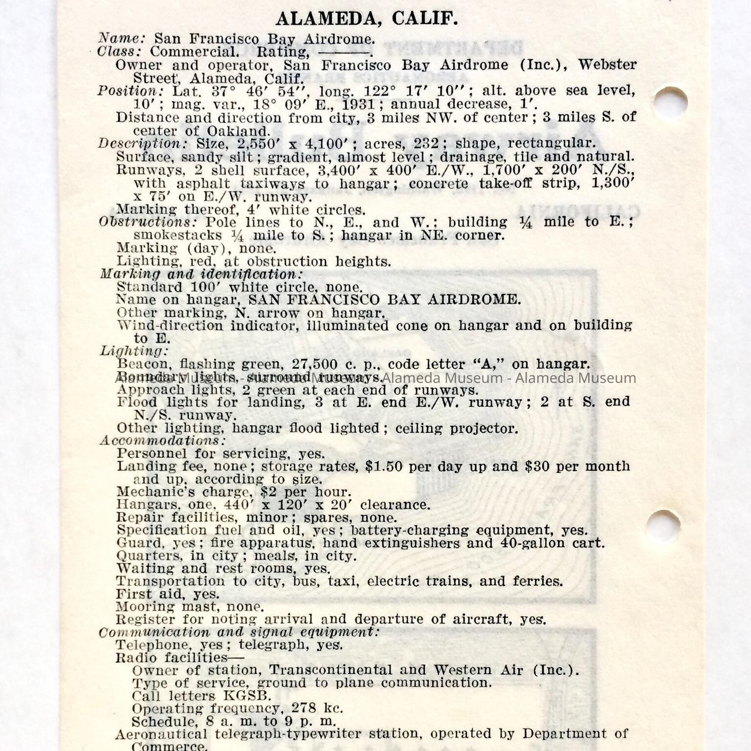 A PAGE REMOVED FROM A BINDER CONCERNING AIRPLANE SERVICE. THE PAGE INCLUDES ANY INFORMATION THAT AN AIRLINE PILOT WOULD WANT TO KNOW CONCERNING THE SAN FRANCISCO BAY AIRDROME THAT WAS LOCATED AT THE SITE OF THE PRESENT ALAMEDA COLLEGE ON WEBSTER ST, ALAMEDA.