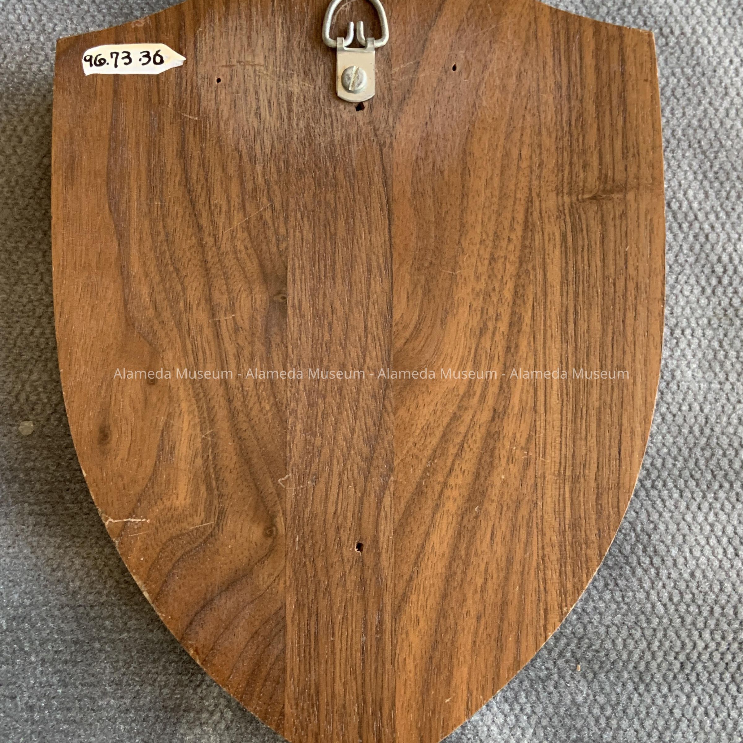 Metal plate on plaque is inscribed: Otto Rittler, Honoring Lifetime Membership Alameda Athletic Association May 14, 1975. Metal loop for hanging is affixed to back of plaque. Size at widest points: length 8 1/8" x width 6".